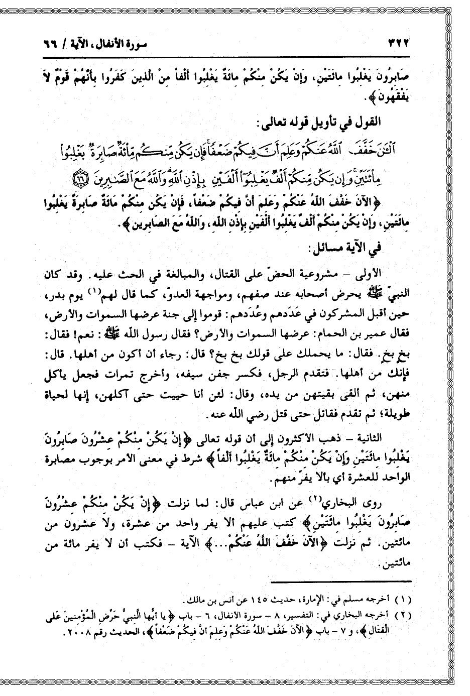 (2) أخرجه البخاري في: التفسير، 8- سورة الأنفال، 6- باب يا أَيُّهَا النَّبِيُّ حَرِّضِ الْمُؤْمِنِينَ عَلَى الْقِتالِ، و 7- باب الْآنَ خَفَّفَ اللَّهُ عَنْكُمْ وَعَلِمَ أَنَّ فِيكُمْ ضَعْفاً، الحديث رقم 2008.
