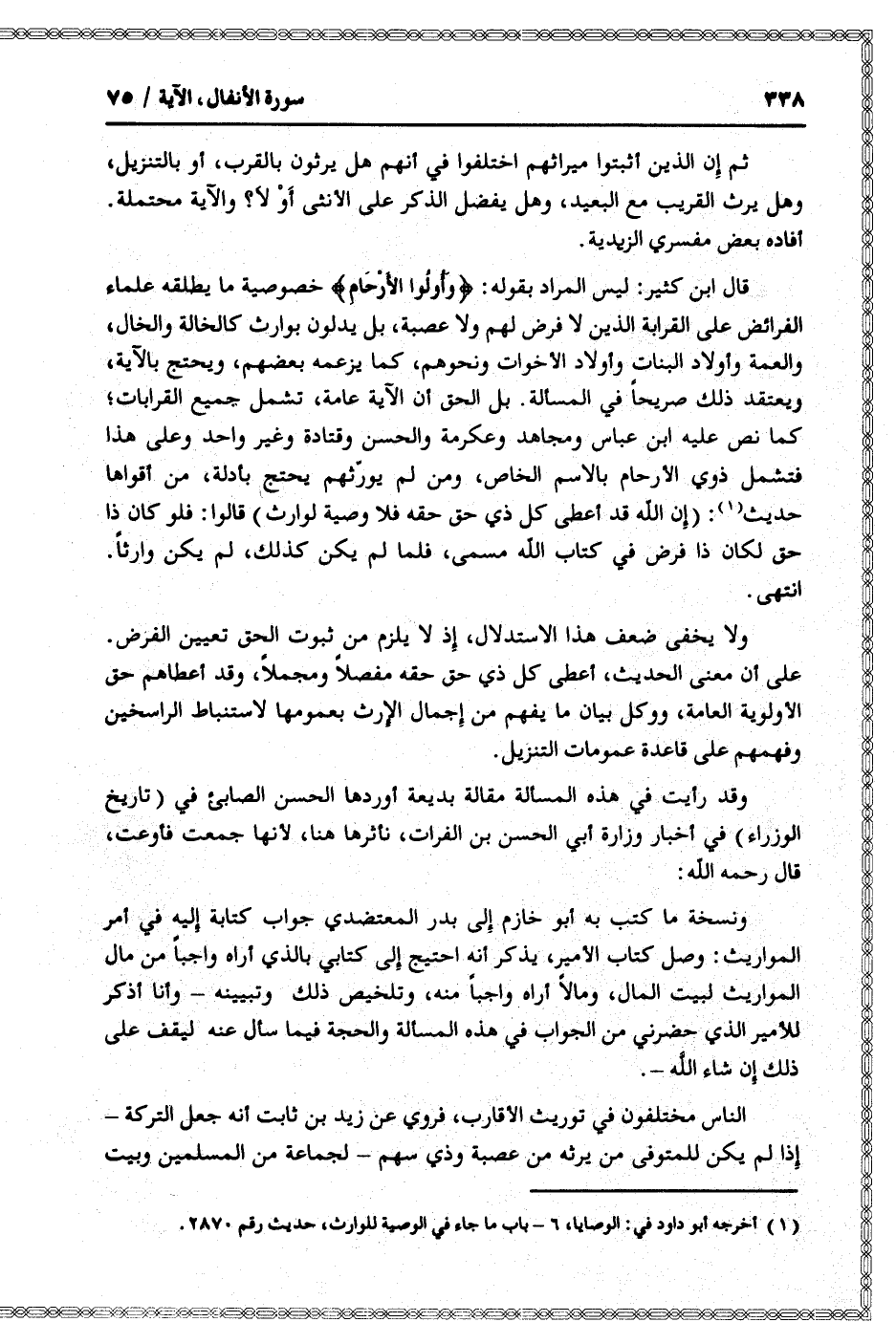 (1) أخرجه أبو داود في: الوصايا، 6- باب ما جاء في الوصية للوارث، حديث رقم 2870.