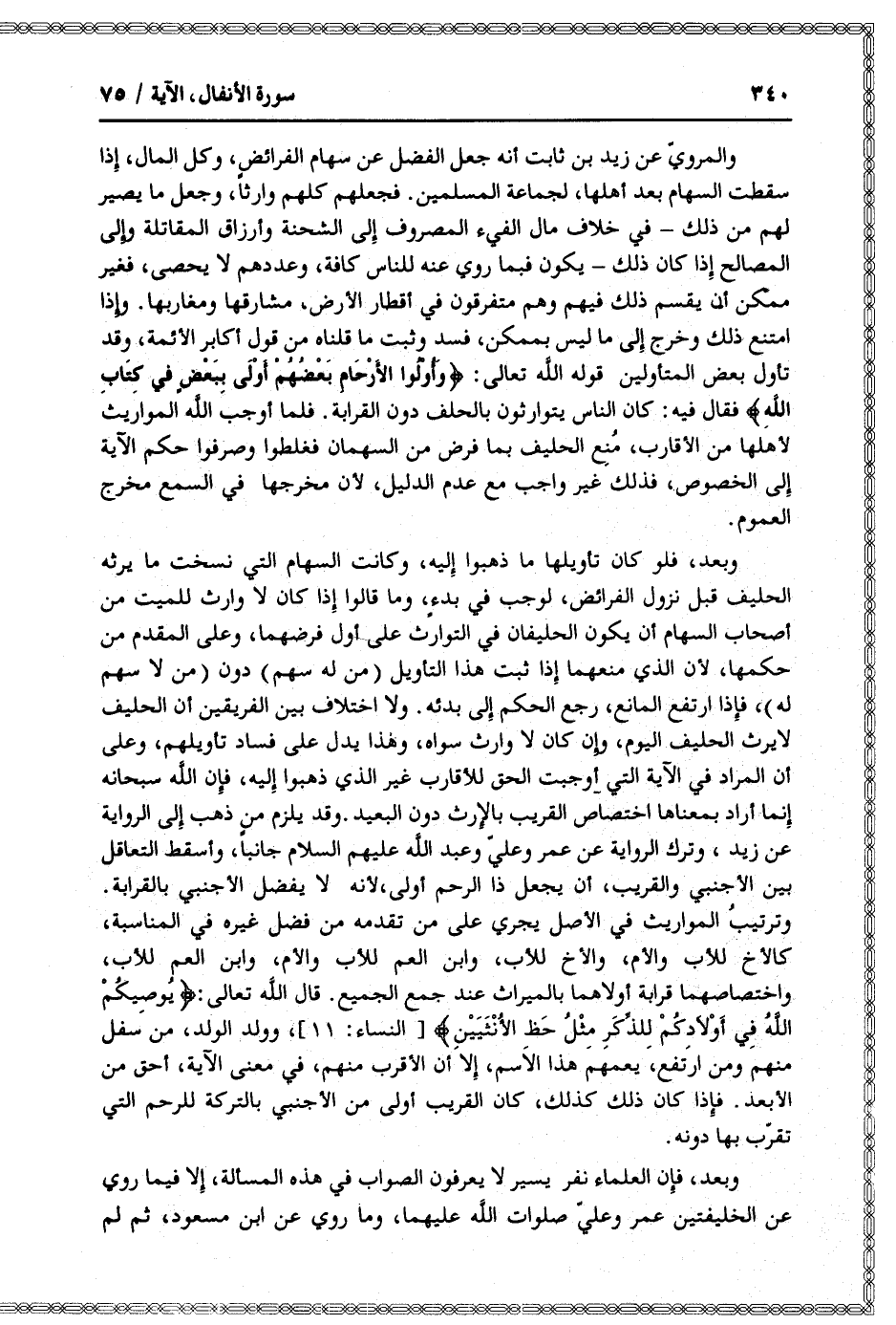 والمرويّ عن زيد بن ثابت أنه جعل الفضل عن سهام الفرائض، وكل المال، إذا سقطت السهام بعد أهلها، لجماعة المسلمين. فجعلهم كلهم وارثا، وجعل ما يصير لهم من ذلك- في خلاف مال الفيء المصروف إلى الشحنة وأرزاق المقاتلة وإلى المصالح إذا كان ذلك- يكون فبما روي عنه للناس كافة، وعددهم لا يحصى، فغير ممكن أن يقسم ذلك فيهم وهم متفرقون في أقطار الأرض، مشارقها ومغاربها. وإذا امتنع ذلك وخرج إلى ما ليس بممكن، فسد وثبت ما قلناه من قول أكابر الأئمة، وقد تأول بعض المتأولين قوله الله تعالى: وَأُولُوا الْأَرْحامِ بَعْضُهُمْ أَوْلى بِبَعْضٍ فِي كِتابِ اللَّهِ فقال فيه: كان الناس يتوارثون بالحلف دون القرابة. فلما أوجب الله المواريث لأهلها من الأقارب، منع الحليف بما فرض من السهمان فغلطوا وصرفوا حكم الآية إلى الخصوص، فذلك غير واجب مع عدم الدليل، لأن مخرجها في السمع مخرج العموم.