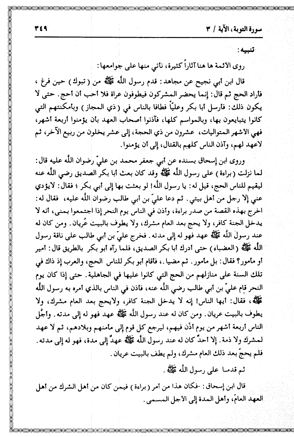 اخرج بهذه القصة من صدر براءة، وأذن في الناس يوم النحر إذا اجتمعوا بمنى، أنه لا يدخل الجنة كافر، ولا يحج بعد العام مشرك، ولا يطوف بالبيت عريان. ومن كان له عند رسول الله صلّى الله عليه وسلّم عهد فهو له إلى مدته. فخرج عليّ بن أبي طالب على ناقة رسول الله صلّى الله عليه وسلّم (العضباء) حتى أدرك أبا بكر الصديق، فلما رآه أبو بكر بالطريق قال: أمير أو مأمور؟ فقال: بل مأمور. ثم مضيا.، فأقام أبو بكر للناس الحج، والعرب إذ ذاك في تلك السنة على منازلهم من الحج التي كانوا عليها في الجاهلية. حتى إذا كان يوم النحر قام عليّ بن أبي طالب رضي الله عنه، فأذن في الناس بالذي أمره به رسول الله صلى الله عليه وسلّم، فقال: أيها الناس! إنه لا يدخل الجنة كافر، ولا يحج بعد العام مشرك، ولا يطوف بالبيت عريان. ومن كان له عند رسول الله صلّى الله عليه وسلّم عهد فهو له إلى مدته. وأجّل الناس أربعة أشهر من يوم أذّن فيهم، ليرجع كل قوم إلى مأمنهم وبلادهم، ثم لا عهد لمشرك ولا ذمة. إلا أحد كان له عند رسول الله صلّى الله عليه وسلّم عهد إلى مدة، فهو له إلى مدته.