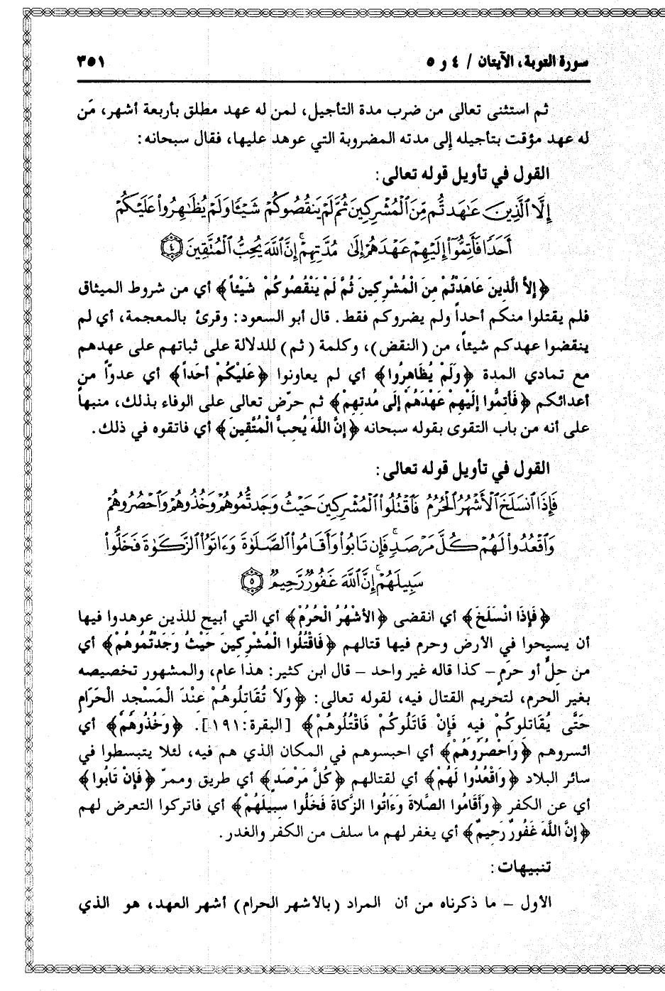 إِلاَّ الَّذِينَ عاهَدْتُمْ مِنَ الْمُشْرِكِينَ ثُمَّ لَمْ يَنْقُصُوكُمْ شَيْئاً وَلَمْ يُظاهِرُوا عَلَيْكُمْ أَحَداً فَأَتِمُّوا إِلَيْهِمْ عَهْدَهُمْ إِلى مُدَّتِهِمْ إِنَّ اللَّهَ يُحِبُّ الْمُتَّقِينَ (4)