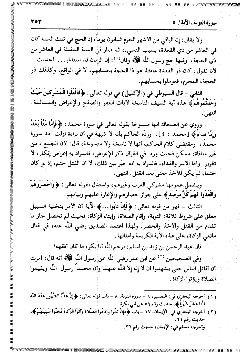 الثاني- قال السيوطي في (الإكليل) في قوله تعالى: فَاقْتُلُوا الْمُشْرِكِينَ حَيْثُ وَجَدْتُمُوهُمْ هذه آية السيف الناسخة لآيات العفو والصفح والإعراض والمسالمة.