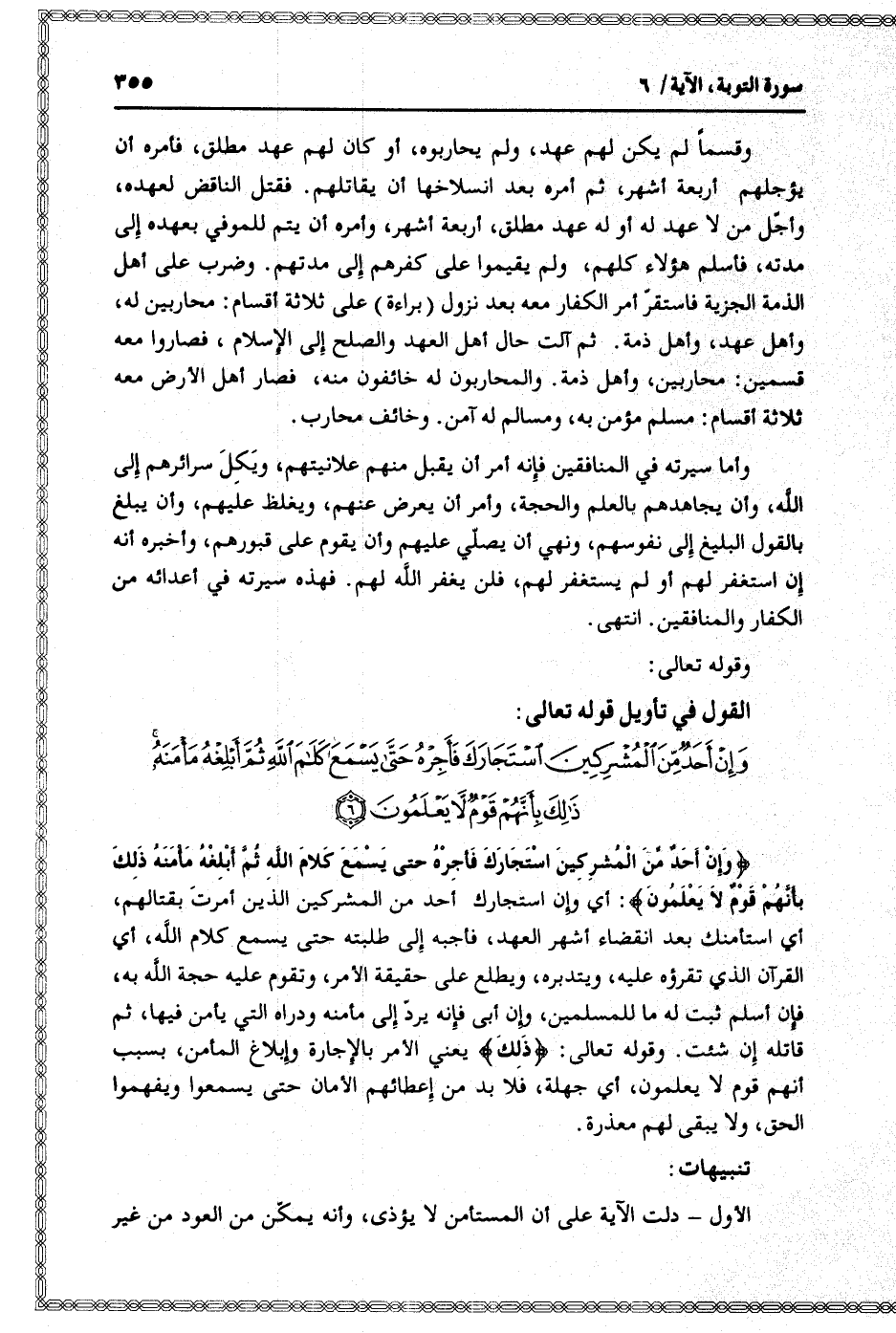 وَإِنْ أَحَدٌ مِنَ الْمُشْرِكِينَ اسْتَجارَكَ فَأَجِرْهُ حَتَّى يَسْمَعَ كَلامَ اللَّهِ ثُمَّ أَبْلِغْهُ مَأْمَنَهُ ذلِكَ بِأَنَّهُمْ قَوْمٌ لا يَعْلَمُونَ (6)