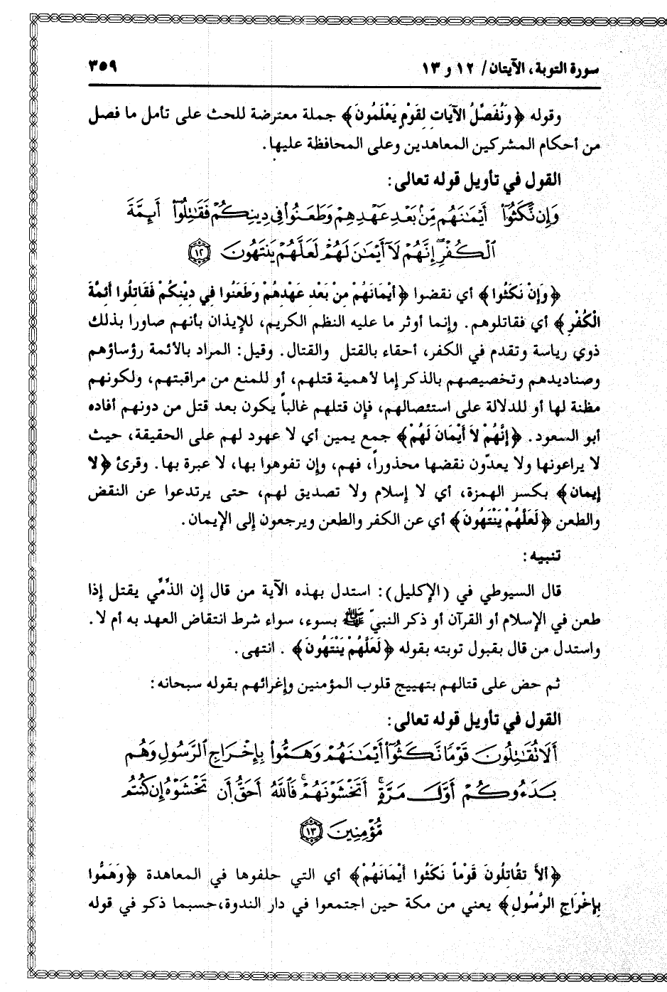 قال السيوطي في (الإكليل) : استدل بهذه الآية من قال إن الذّمّي يقتل إذا طعن في الإسلام أو القرآن أو ذكر النبيّ صلّى الله عليه وسلّم بسوء، سواء شرط انتقاض العهد به أم لا.