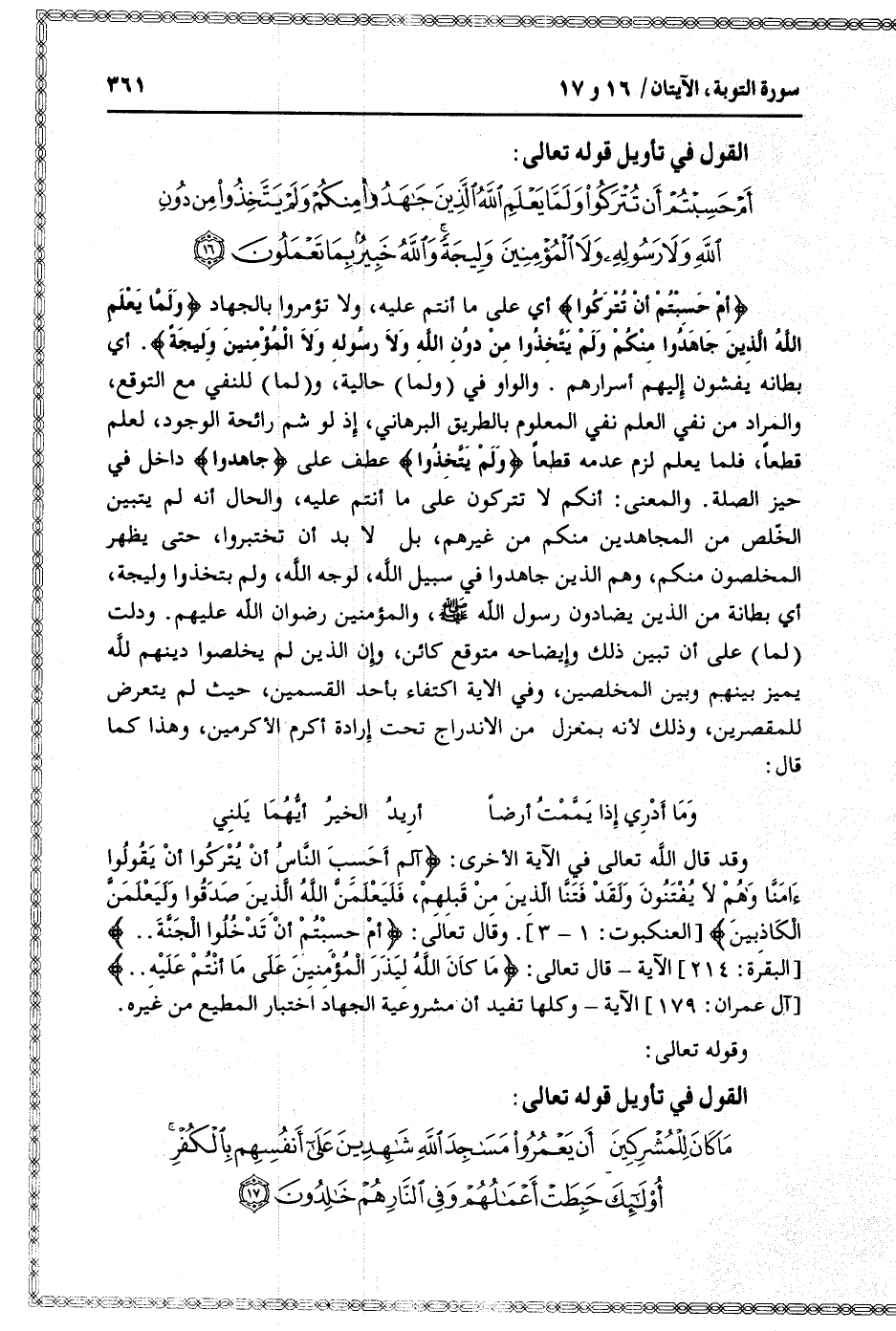 أَمْ حَسِبْتُمْ أَنْ تُتْرَكُوا وَلَمَّا يَعْلَمِ اللَّهُ الَّذِينَ جاهَدُوا مِنْكُمْ وَلَمْ يَتَّخِذُوا مِنْ دُونِ اللَّهِ وَلا رَسُولِهِ وَلا الْمُؤْمِنِينَ وَلِيجَةً وَاللَّهُ خَبِيرٌ بِما تَعْمَلُونَ (16)