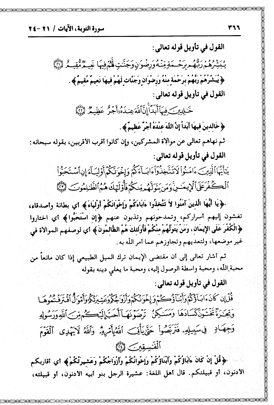 قُلْ إِنْ كانَ آباؤُكُمْ وَأَبْناؤُكُمْ وَإِخْوانُكُمْ وَأَزْواجُكُمْ وَعَشِيرَتُكُمْ وَأَمْوالٌ اقْتَرَفْتُمُوها وَتِجارَةٌ تَخْشَوْنَ كَسادَها وَمَساكِنُ تَرْضَوْنَها أَحَبَّ إِلَيْكُمْ مِنَ اللَّهِ وَرَسُولِهِ وَجِهادٍ فِي سَبِيلِهِ فَتَرَبَّصُوا حَتَّى يَأْتِيَ اللَّهُ بِأَمْرِهِ وَاللَّهُ لا يَهْدِي الْقَوْمَ الْفاسِقِينَ (24)