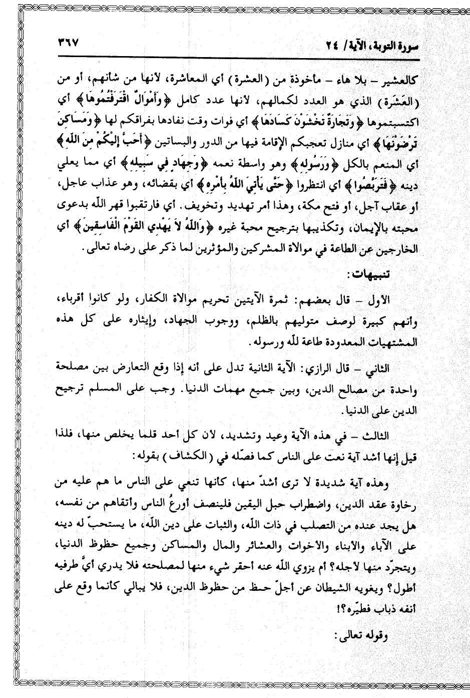 الثاني- قال الرازي: الآية الثانية تدل على أنه إذا وقع التعارض بين مصلحة واحدة من مصالح الدين، وبين جميع مهمات الدنيا. وجب على المسلم ترجيح الدين على الدنيا.