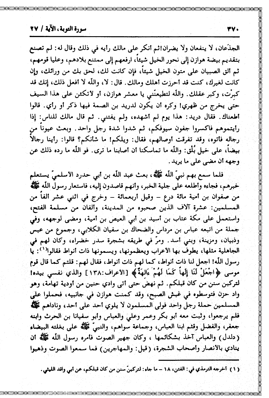 . ثم نهض حتى أتى وادي حنين من أودية تهامة، وهو واد حزن فتوسطوه في غبش الصبح، وقد كمنت هوازن في جانبيه، فحملوا على المسلمين حملة رجل واحد فولى المسلمون لا يلوي أحد على أحد، وناداهم صلّى الله عليه وسلّم فلم يرجعوا، وثبت معه أبو بكر وعمر وعلي والعباس وأبو سفيان بن الحرث وابنه جعفر، والفضل وقثم ابنا العباس، وجماعة سواهم، والنبيّ صلّى الله عليه وسلّم على بغلته البيضاء (دلدل) والعباس آخذ بشكائمها، وكان جهير الصوت فأمره رسول الله صلّى الله عليه وسلّم أن ينادي بالأنصار وأصحاب الشجرة، (قيل: والمهاجرين) فما سمعوا الصوت وذهبوا