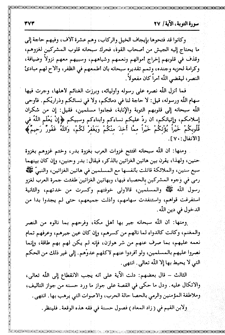 ومنها: أن الله سبحانه افتتح غزوات العرب بغزوة بدر، وختم غزوهم بغزوة حنين، ولهذا، يقرن بين هاتين الغزاتين بالذكر، فيقال: بدر وحنين، وإن كان بينهما سبع سنين، والملائكة قاتلت بأنفسها مع المسلمين في هاتين الغزاتين، والنبيّ صلّى الله عليه وسلّم رمى في وجوه المشركين بالحصباء فيها، وبهاتين الغزاتين طفئت جمرة العرب لغزو رسول الله صلّى الله عليه وسلّم والمسلمين، فالأولى خوفتهم وكسرت من خدتهم، والثانية استفرغت قواهم، واستنفدت سهامهم، وأذلت جميعهم، حتى لم يجدوا بدا من الدخول في دين الله.