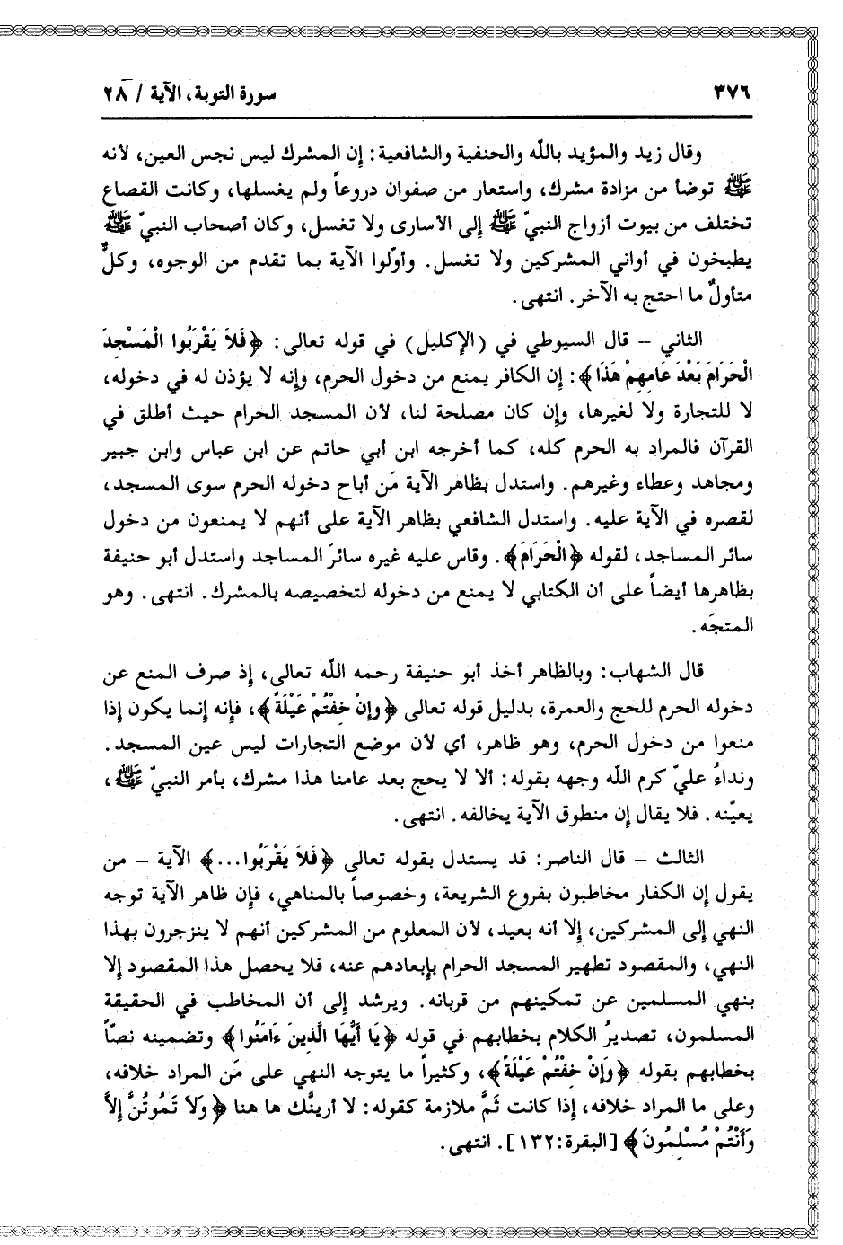 الثاني- قال السيوطي في (الإكليل) في قوله تعالى: فَلا يَقْرَبُوا الْمَسْجِدَ الْحَرامَ بَعْدَ عامِهِمْ هذا: إن الكافر يمنع من دخول الحرم، وإنه لا يؤذن له في دخوله، لا للتجارة ولا لغيرها، وإن كان مصلحة لنا، لأن المسجد الحرام حيث أطلق في القرآن فالمراد به الحرم كله، كما أخرجه ابن أبي حاتم عن ابن عباس وابن جبير ومجاهد وعطاء وغيرهم. واستدل الشافعي بظاهر الآية من أباح دخوله الحرم سوى المسجد، لقصره في الآية عليه. واستدل الشافعي بظاهر الآية على أنهم لا يمنعون من دخول سائر المساجد، لقوله الْحَرامَ. وقاس عليه غيره سائر المساجد واستدل أبو حنيفة بظاهرها أيضا على أن الكتابي لا يمنع من دخوله لتخصيصه بالمشرك. انتهى. وهو المتجه.