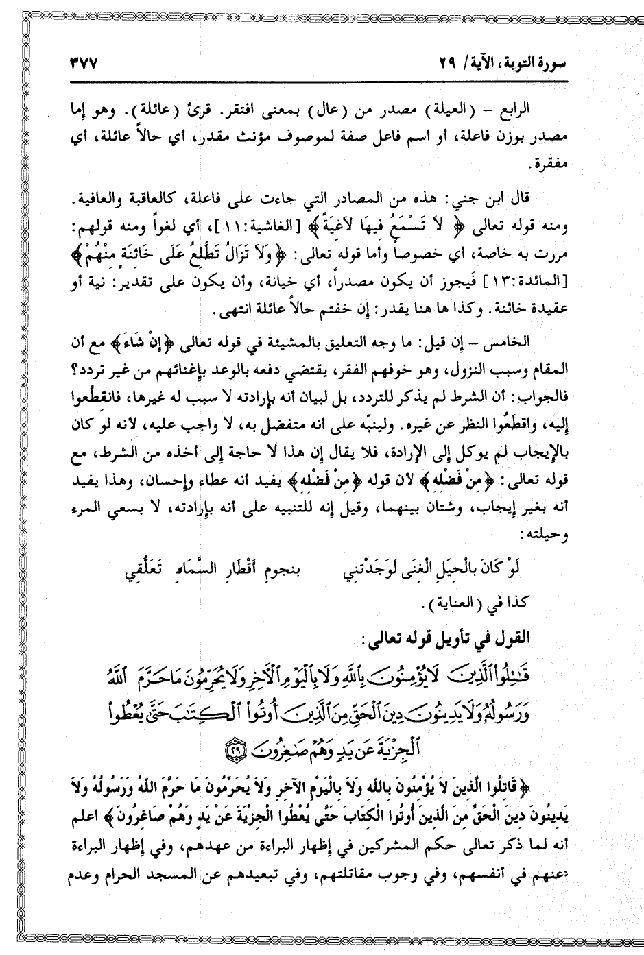 قاتِلُوا الَّذِينَ لا يُؤْمِنُونَ بِاللَّهِ وَلا بِالْيَوْمِ الْآخِرِ وَلا يُحَرِّمُونَ ما حَرَّمَ اللَّهُ وَرَسُولُهُ وَلا يَدِينُونَ دِينَ الْحَقِّ مِنَ الَّذِينَ أُوتُوا الْكِتابَ حَتَّى يُعْطُوا الْجِزْيَةَ عَنْ يَدٍ وَهُمْ صاغِرُونَ (29)