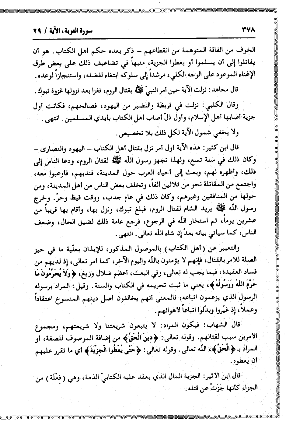 قال ابن كثير: هذه الآية أول أمر نزل بقتال أهل الكتاب- اليهود والنصارى- وكان ذلك في سنة تسع، ولهذا تجهز رسول الله صلّى الله عليه وسلّم لقتال الروم، ودعا الناس إلى ذلك، وأظهره لهم، وبعث إلى أحياء العرب حول المدينة، فندبهم، فأوعبوا معه، واجتمع من المقاتلة نحو من ثلاثين ألفا، وتخلف بعض الناس من أهل المدينة، ومن حولها من المنافقين وغيرهم، وكان ذلك في عام جدب، ووقت قيظ وحرّ. وخرج رسول الله صلّى الله عليه وسلّم يريد الشام لقتال الروم، فبلغ تبوك، ونزل بها، وأقام بها قريبا من عشرين يوما، ثم استخار الله في الرجوع، فرجع عامة ذلك لضيق الحال، وضعف الناس، كما سيأتي بيانه بعد إن شاء الله تعالى. انتهى.