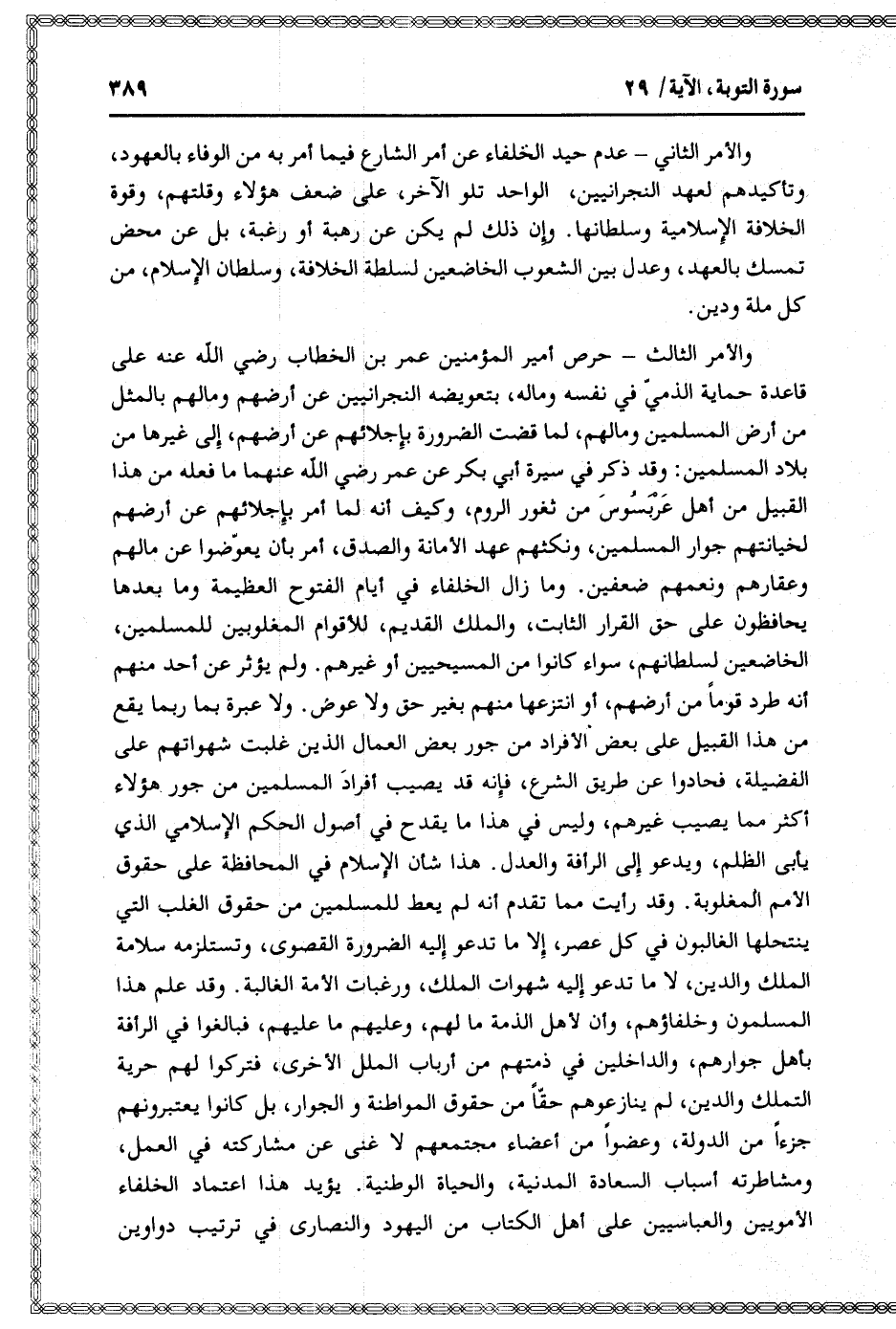 والأمر الثالث- حرص أمير المؤمنين عمر بن الخطاب رضي الله عنه على قاعدة حماية الذميّ في نفسه وماله، بتعويضه النجرانيين عن أرضهم ومالهم بالمثل من أرض المسلمين ومالهم، لما قضت الضرورة بإجلائهم عن أرضهم، إلى غيرها من بلاد المسلمين: وقد ذكر في سيرة أبي بكر عن عمر رضي الله عنهما ما فعله من هذا القبيل من أهل عربسوس من ثغور الروم، وكيف أنه لما أمر بإجلائهم عن أرضهم لخيانتهم جوار المسلمين، ونكثهم عهد الأمانة والصدق، أمر بأن يعوّضوا عن مالهم وعقارهم ونعمهم ضعفين. وما زال الخلفاء في أيام الفتوح العظيمة وما بعدها يحافظون على حق القرار الثابت، والملك القديم، للأقوام المغلوبين للمسلمين، الخاضعين لسلطانهم، سواء كانوا من المسيحيين أو غيرهم. ولم يؤثر عن أحد منهم أنه طرد قوما من أرضهم، أو انتزعها منهم بغير حق ولا عوض. ولا عبرة بما ربما يقع من هذا القبيل على بعض الأفراد من جور بعض العمال الذين غلبت شهواتهم على الفضيلة، فحادوا عن طريق الشرع، فإنه قد يصيب أفراد المسلمين من جور هؤلاء أكثر مما يصيب غيرهم، وليس في هذا ما يقدح في أصول الحكم الإسلامي الذي يأبى الظلم، ويدعو إلى الرأفة والعدل. هذا شأن الإسلام في المحافظة على حقوق الأمم المغلوبة. وقد رأيت مما تقدم أنه لم يعط للمسلمين من حقوق الغلب التي ينتحلها الغالبون في كل عصر، إلا ما تدعو إليه الضرورة القصوى، وتستلزمه سلامة الملك والدين، لا ما تدعو إليه شهوات الملك، ورغبات الأمة الغالبة. وقد علم هذا المسلمون وخلفاؤهم، وأن لأهل الذمة ما لهم، وعليهم ما عليهم، فبالغوا في الرأفة بأهل جوارهم، والداخلين في ذمتهم من أرباب الملل الأخرى، فتركوا لهم حرية التملك والدين، لم ينازعوهم حقّا من حقوق المواطنة والجوار، بل كانوا يعتبرونهم جزءا من الدولة، وعضوا من أعضاء مجتمعهم لا غنى عن مشاركته في العمل، ومشاطرته أسباب السعادة المدنية، والحياة الوطنية. يؤيد هذا اعتماد الخلفاء الأمويين والعباسيين على أهل الكتاب من اليهود والنصارى في ترتيب دواوين