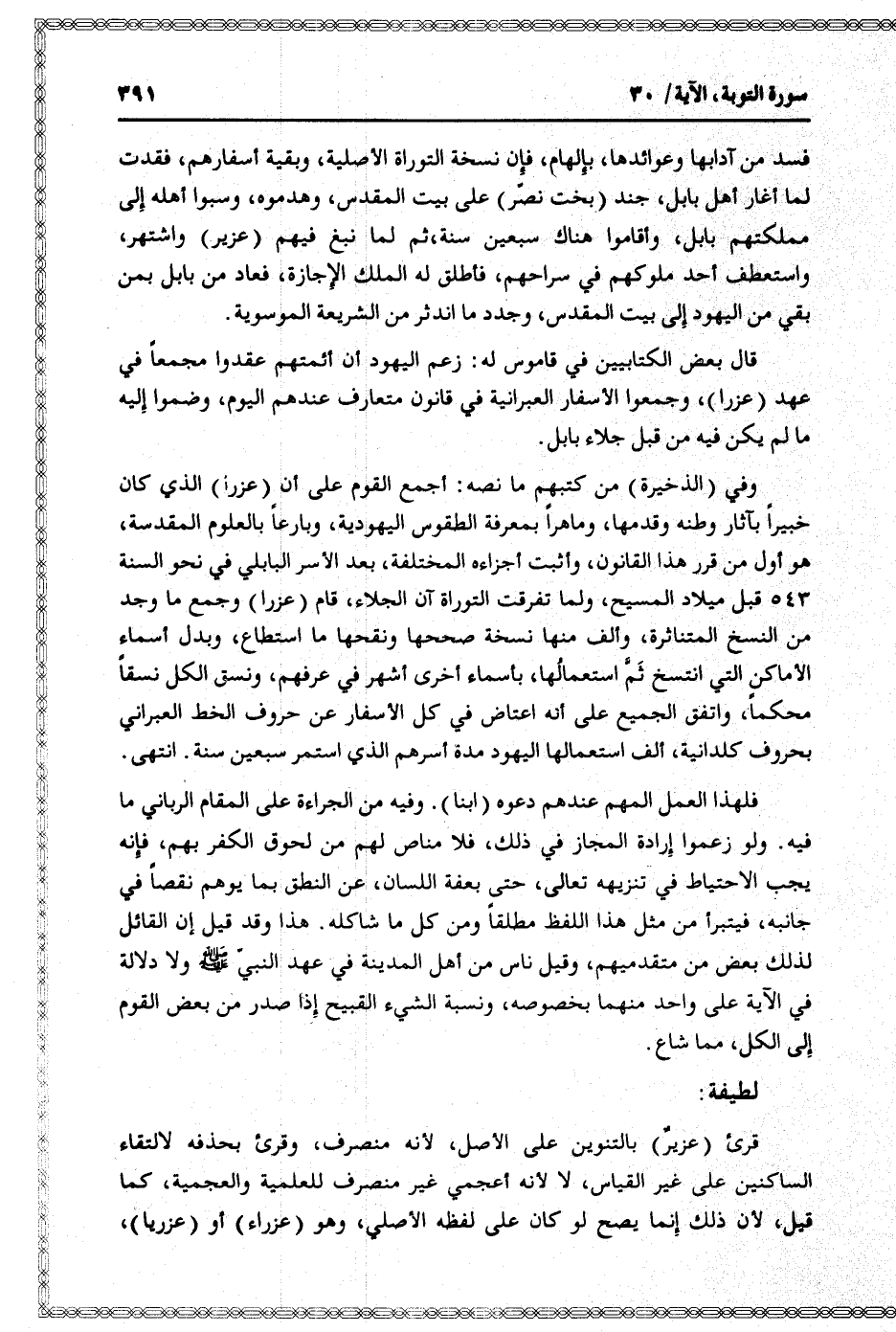 وفي (الذخيرة) من كتبهم ما نصه: أجمع القوم على أن (عزرا) الذي كان خبيرا بآثار وطنه وقدمها، وماهرا بمعرفة الطقوس اليهودية، وبارعا بالعلوم المقدسة، هو أول من قرر هذا القانون، وأثبت أجزاءه المختلفة، بعد الأسر البابلي في نحو السنة 543 قبل ميلاد المسيح، ولما تفرقت التوراة آن الجلاء، قام (عزرا) وجمع ما وجد من النسخ المتناثرة، وألف منها نسخة صححها ونقحها ما استطاع، وبدل أسماء الأماكن التي انتسخ ثمّ استعمالها، بأسماء أخرى أشهر في عرفهم، ونسق الكل نسقا محكما، واتفق الجميع على أنه اعتاض في كل الأسفار عن حروف الخط العبراني بحروف كلدانية، ألف استعمالها اليهود مدة أسرهم الذي استمر سبعين سنة. انتهى.