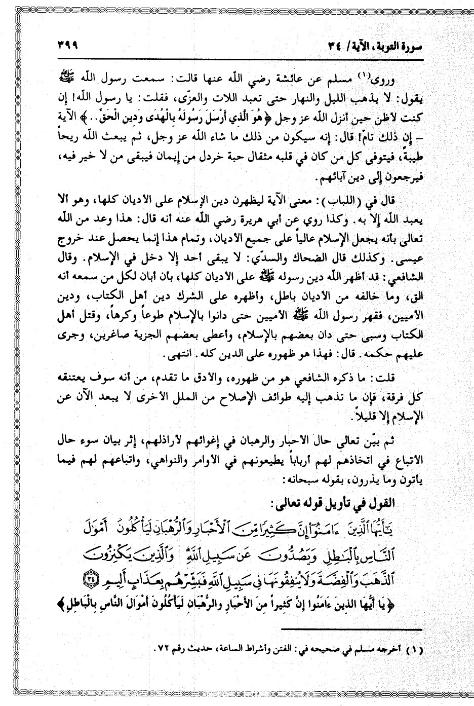 يا أَيُّهَا الَّذِينَ آمَنُوا إِنَّ كَثِيراً مِنَ الْأَحْبارِ وَالرُّهْبانِ لَيَأْكُلُونَ أَمْوالَ النَّاسِ بِالْباطِلِ وَيَصُدُّونَ عَنْ سَبِيلِ اللَّهِ وَالَّذِينَ يَكْنِزُونَ الذَّهَبَ وَالْفِضَّةَ وَلا يُنْفِقُونَها فِي سَبِيلِ اللَّهِ فَبَشِّرْهُمْ بِعَذابٍ أَلِيمٍ (34)