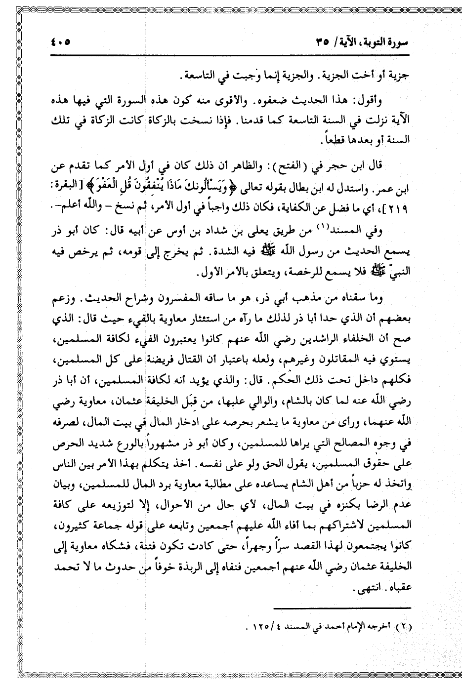 وما سقناه من مذهب أبي ذر، هو ما ساقه المفسرون وشراح الحديث. وزعم بعضهم أن الذي حدا أبا ذر لذلك ما رآه من استئثار معاوية بالفيء حيث قال: الذي صح أن الخلفاء الراشدين رضي الله عنهم كانوا يعتبرون الفيء لكافة المسلمين، يستوي فيه المقاتلون وغيرهم، ولعله باعتبار أن القتال فريضة على كل المسلمين، فكلهم داخل تحت ذلك الحكم. قال: والذي يؤيد أنه لكافة المسلمين، أن أبا ذر رضي الله عنه لما كان بالشام، والوالي عليها، من قبل الخليفة عثمان، معاوية رضي الله عنهما، ورأى من معاوية ما يشعر بحرصه على ادخار المال في بيت المال، لصرفه في وجوه المصالح التي يراها للمسلمين، وكان أبو ذر مشهورا بالورع شديد الحرص على حقوق المسلمين، يقول الحق ولو على نفسه. أخذ يتكلم بهذا الأمر بين الناس واتخذ له حزبا من أهل الشام يساعده على مطالبة معاوية برد المال للمسلمين، وبيان عدم الرضا بكنزه في بيت المال، لأي حال من الأحوال، إلا لتوزيعه على كافة المسلمين لاشتراكهم بما أفاء الله عليهم أجمعين وتابعه على قوله جماعة كثيرون، كانوا يجتمعون لهذا القصد سرّا وجهرا، حتى كادت تكون فتنة، فشكاه معاوية إلى الخليفة عثمان رضي الله عنهم أجمعين فنفاه إلى الربذة خوفا من حدوث ما لا تحمد عقباه. انتهى.