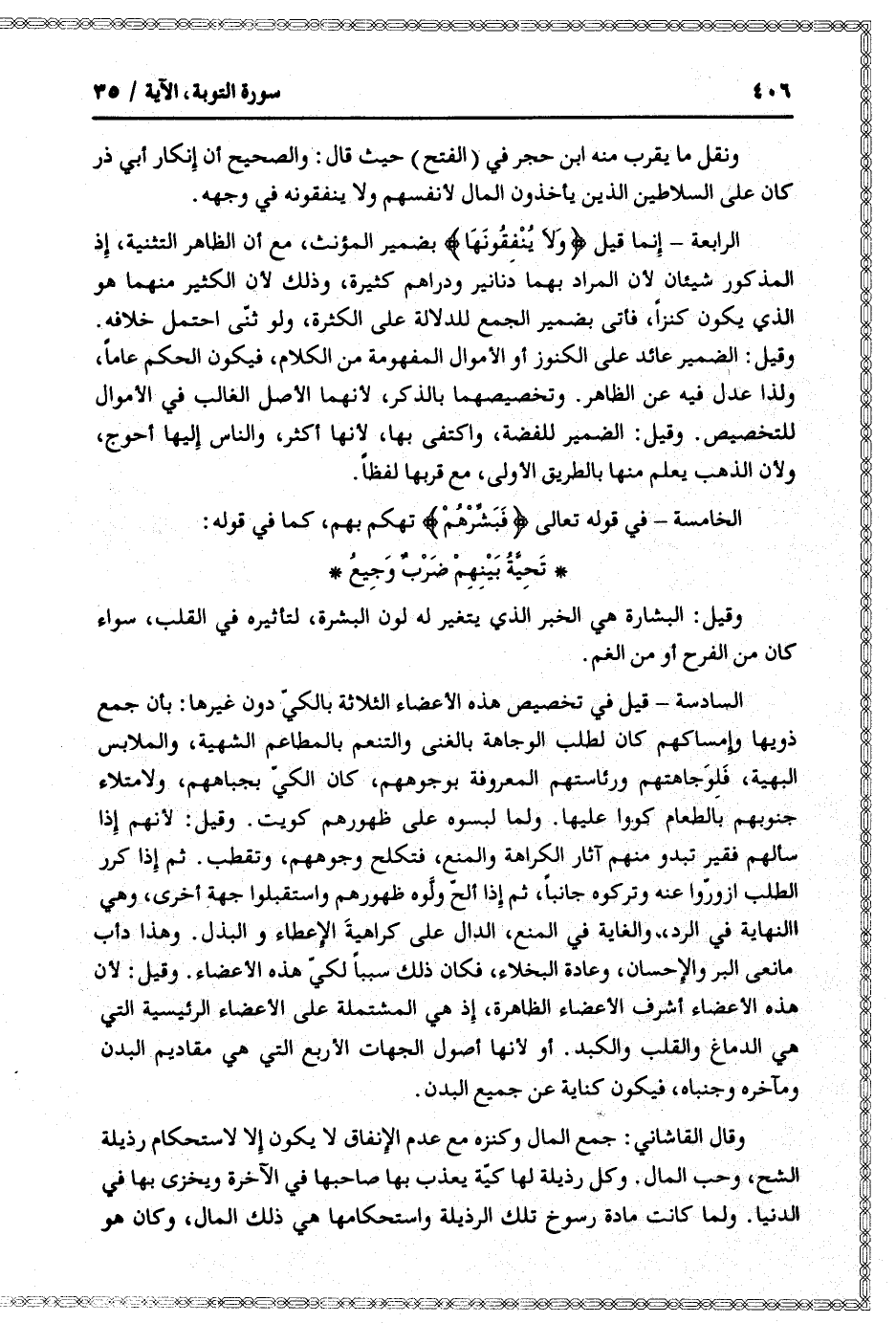 السادسة- قيل في تخصيص هذه الأعضاء الثلاثة بالكيّ دون غيرها: بأن جمع ذويها وإمساكهم كان لطلب الوجاهة بالغنى والتنعم بالمطاعم الشهية، والملابس البهية، فلوجاهتهم ورئاستهم المعروفة بوجوههم، كان الكيّ بجباههم، ولامتلاء جنوبهم بالطعام كووا عليها. ولما لبسوه على ظهورهم كويت. وقيل: لأنهم إذا سألهم فقير تبدو منهم آثار الكراهة والمنع، فتكلح وجوههم، وتقطب. ثم إذا كرر الطلب ازورّوا عنه وتركوه جانبا، ثم إذا ألحّ ولّوه، ظهورهم واستقبلوا جهة أخرى، وهي النهاية في الرد، والغاية في المنع، الدال على كراهية الإعطاء والبذل. وهذا دأب مانعي البر والإحسان، وعادة البخلاء، فكان ذلك سببا لكيّ على الأعضاء. وقيل: لأن هذه الأعضاء أشرف الأعضاء الظاهرة، إذ هي المشتملة على الأعضاء الرئيسية التي هي الدماغ والقلب والكبد. أو لأنها أصول الجهات الأربع التي هي مقاديم البدن ومآخره وجنباه، فيكون كناية عن جميع البدن.