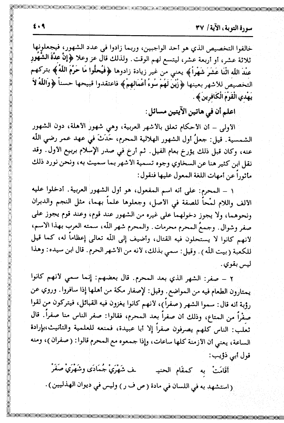 1- المحرم: على أنه اسم المفعول، هو أول الشهور العربية. أدخلوا عليه الألف واللام لمحا للصفة في الأصل، وجعلوها علما بهما، مثل النجم والدبران ونحوهما، ولا يجوز دخولهما على غيره من الشهور عند قوم، وعند قوم يجوز على صفر وشوال. وجمع المحرم محرمات. والمحرم شهر الله، سمته العرب بهذا الاسم، لأنهم كانوا لا يستحلون فيه القتال، وأضيف إلى الله تعالى إعظاما له، كما قيل للكعبة (بيت الله) . وقيل: سمي بذلك، لأنه من الأشهر الحرم. قال ابن سيده: وهذا ليس بقوي.