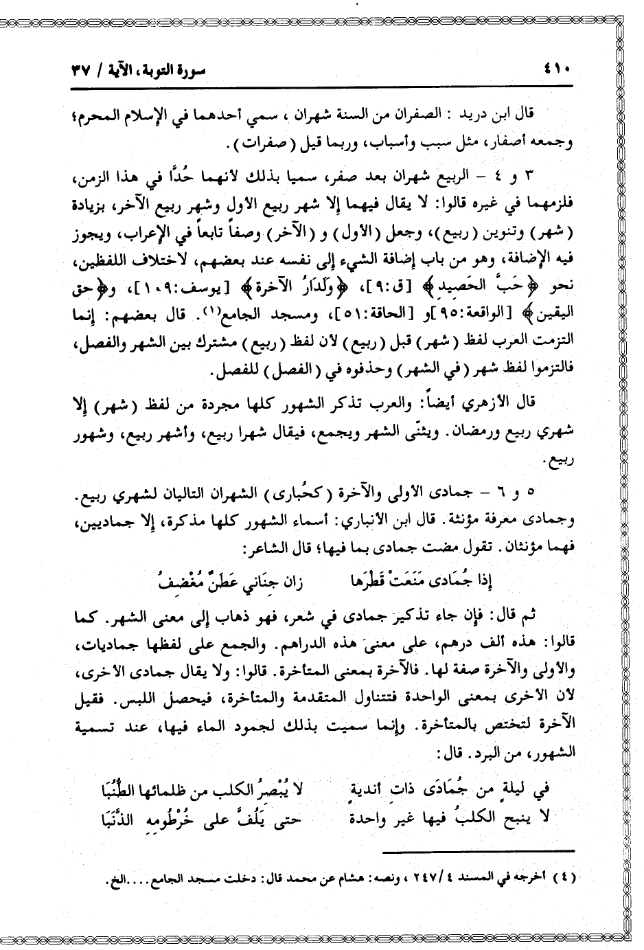 3 و 4- الربيع شهران بعد صفر، سميا بذلك لأنهما حدّا في هذا الزمن، فلزمهما في غيره قالوا: لا يقال فيهما إلا شهر ربيع الأول وشهر ربيع الآخر، بزيادة (شهر) وتنوين (ربيع) ، وجعل (الأول) و (الآخر) وصفا تابعا في الإعراب، ويجوز فيه الإضافة، وهو من باب إضافة الشيء إلى نفسه عند بعضهم، لاختلاف اللفظين، نحو حَبَّ الْحَصِيدِ [ق: 9] ، وَلَدارُ الْآخِرَةِ [يوسف: 109] ، وحَقُّ الْيَقِينِ [الواقعة: 95] و [الحاقة: 51] ، ومسجد الجامع «1» . قال بعضهم: إنما التزمت العرب لفظ (شهر) قبل (ربيع) لأن لفظ (ربيع) مشترك بين الشهر والفصل، فالتزموا لفظ شهر (في الشهر) وحذفوه في (الفصل) للفصل.
