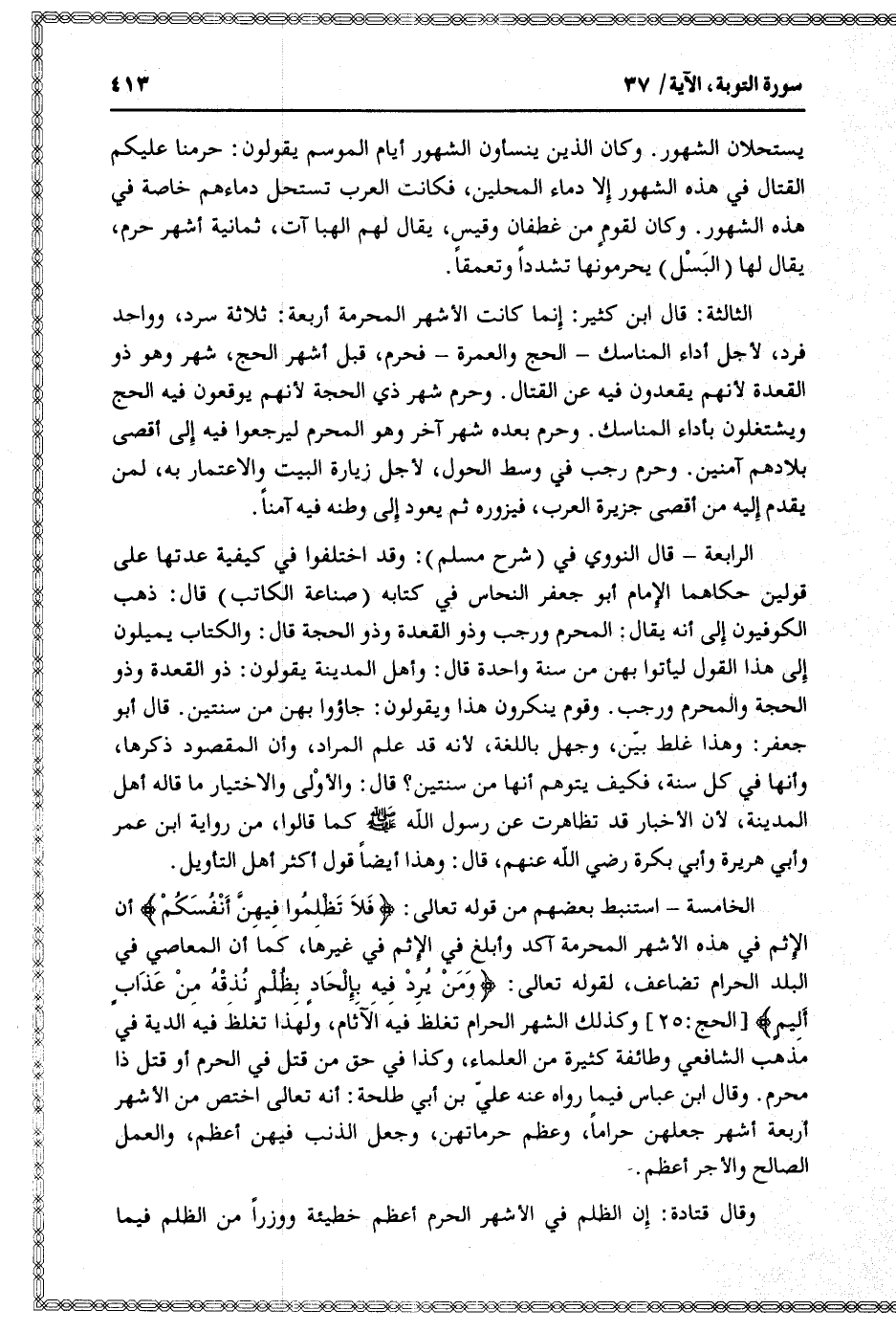 الثالثة: قال ابن كثير: إنما كانت الأشهر المحرمة أربعة: ثلاثة سرد، وواحد فرد، لأجل أداء المناسك- الحج والعمرة- فحرم، قبل أشهر الحج، شهر وهو ذو القعدة لأنهم يقعدون فيه عن القتال. وحرم شهر ذي الحجة لأنهم يوقعون فيه الحج ويشتغلون بأداء المناسك. وحرم بعده شهر آخر وهو المحرم ليرجعوا فيه إلى أقصى بلادهم آمنين. وحرم رجب في وسط الحول، لأجل زيارة البيت والاعتمار به، لمن يقدم إليه من أقصى جزيرة العرب، فيزوره ثم يعود إلى وطنه فيه آمنا.
