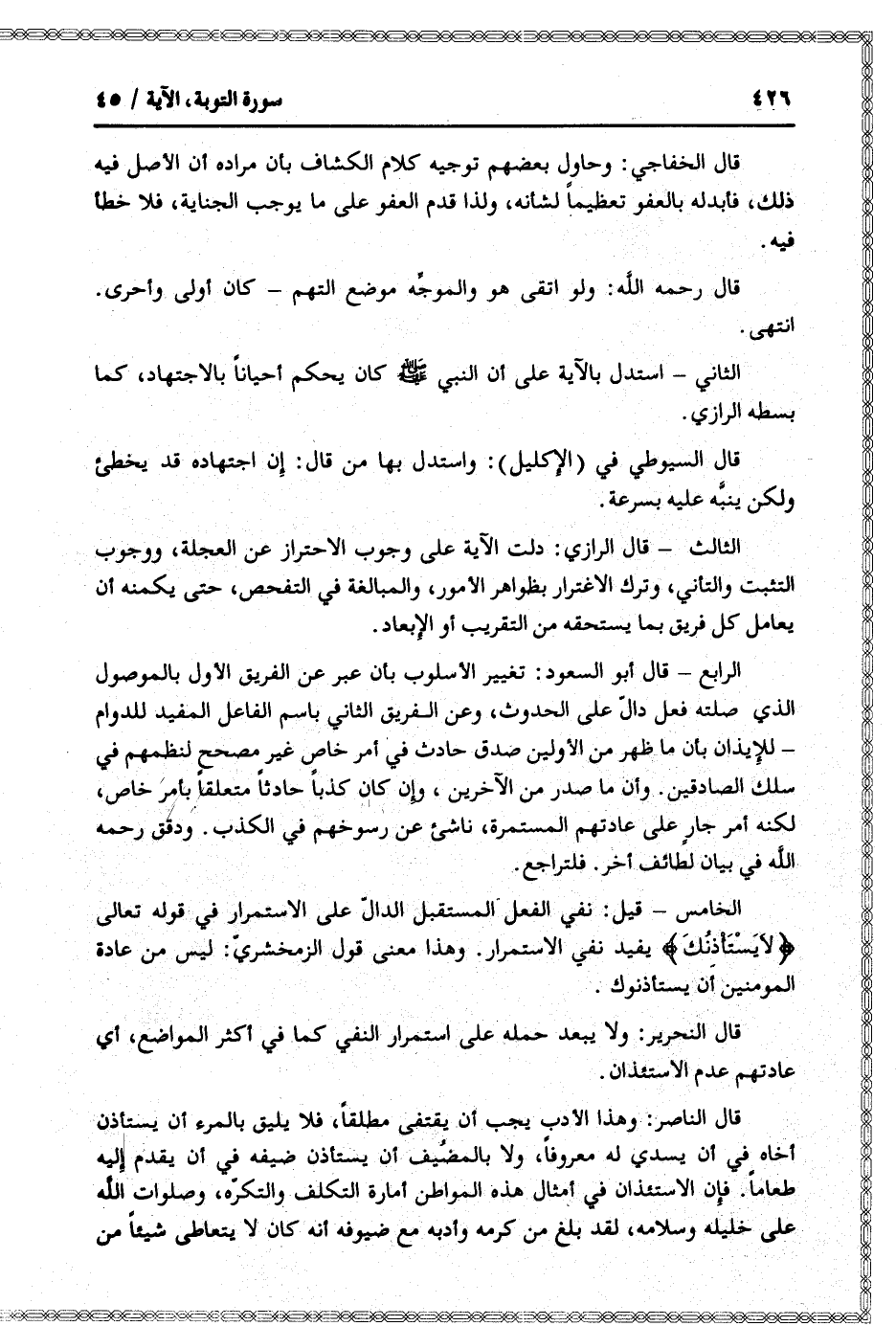 الخامس- قيل: نفي الفعل المستقبل الدالّ على الاستمرار في قوله تعالى لا يَسْتَأْذِنُكَ يفيد نفي الاستمرار. وهذا معنى قول الزمخشريّ: ليس من عادة المؤمنين أن يستأذنوك.