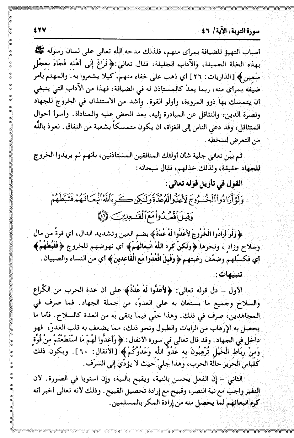 القول في تأويل قوله تعالى: [سورة التوبة (9) : آية 46]