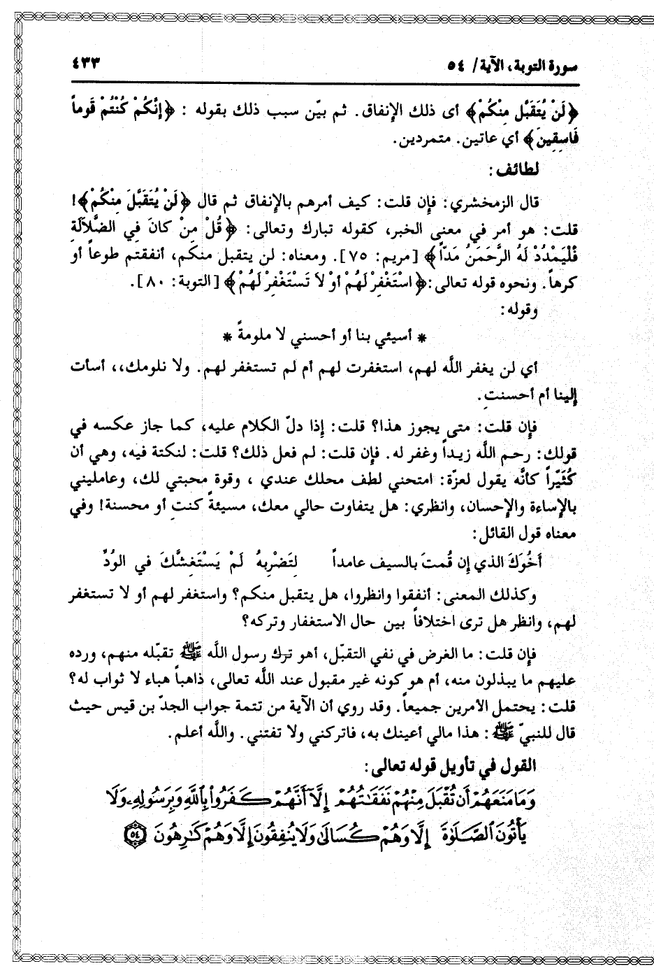 فإن قلت: ما الغرض في نفي التقبّل، أهو ترك رسول الله صلّى الله عليه وسلّم تقبّله منهم، ورده عليهم ما يبذلون منه، أم هو كونه غير مقبول عند الله تعالى، ذاهبا هباء لا ثواب له؟