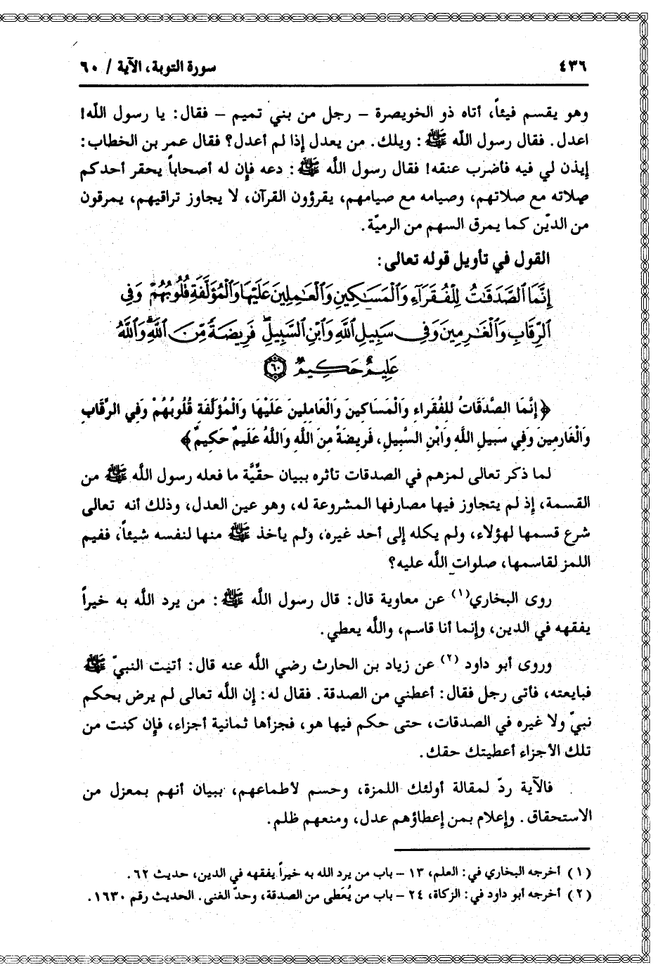 إِنَّمَا الصَّدَقاتُ لِلْفُقَراءِ وَالْمَساكِينِ وَالْعامِلِينَ عَلَيْها وَالْمُؤَلَّفَةِ قُلُوبُهُمْ وَفِي الرِّقابِ وَالْغارِمِينَ وَفِي سَبِيلِ اللَّهِ وَابْنِ السَّبِيلِ فَرِيضَةً مِنَ اللَّهِ وَاللَّهُ عَلِيمٌ حَكِيمٌ (60)