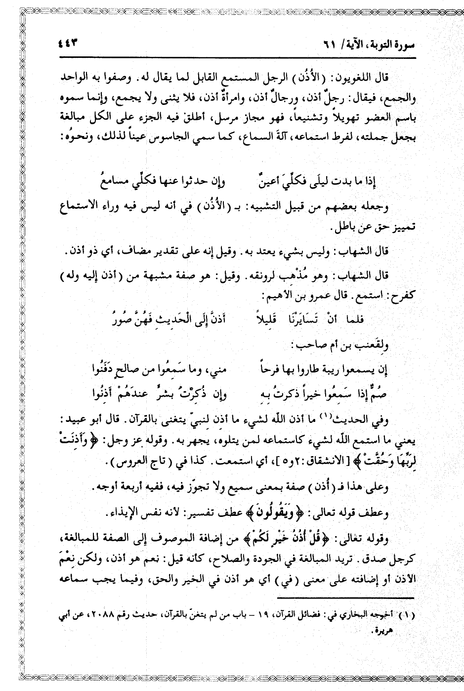(1) أخرجه البخاري في: فضائل القرآن، 19- باب من لم يتغنّ بالقرآن، حديث رقم 2088، عن أبي هريرة.