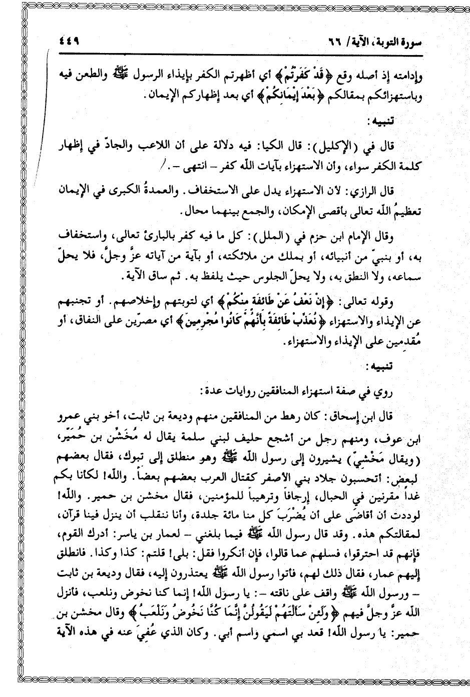 وقال الإمام ابن حزم في (الملل) : كل ما فيه كفر بالبارئ تعالى، واستخفاف به، أو بنبيّ من أنبيائه، أو بملك من ملائكته، أو بآية من آياته عزّ وجلّ، فلا يحلّ سماعه، ولا النطق به، ولا يحلّ الجلوس حيث يلفظ به. ثم ساق الآية.