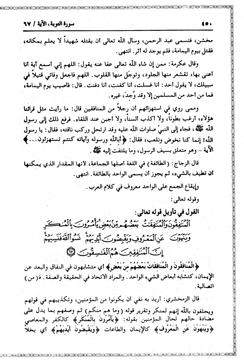الْمُنافِقُونَ وَالْمُنافِقاتُ بَعْضُهُمْ مِنْ بَعْضٍ يَأْمُرُونَ بِالْمُنْكَرِ وَيَنْهَوْنَ عَنِ الْمَعْرُوفِ وَيَقْبِضُونَ أَيْدِيَهُمْ نَسُوا اللَّهَ فَنَسِيَهُمْ إِنَّ الْمُنافِقِينَ هُمُ الْفاسِقُونَ (67)