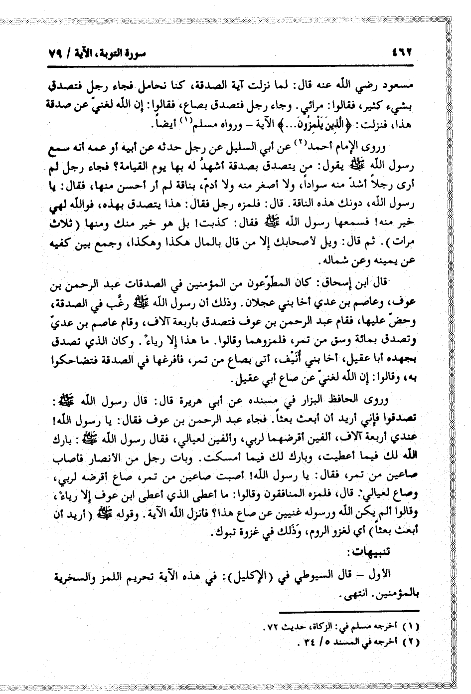 مسعود رضي الله عنه قال: لما نزلت آية الصدقة، كنا نحامل فجاء رجل فتصدق بشيء كثير، فقالوا: مرائي. وجاء رجل فتصدق بصاع، فقالوا: إن الله لغنيّ عن صدقة هذا، فنزلت: الَّذِينَ يَلْمِزُونَ ... الآية- ورواه مسلم «1» أيضا.