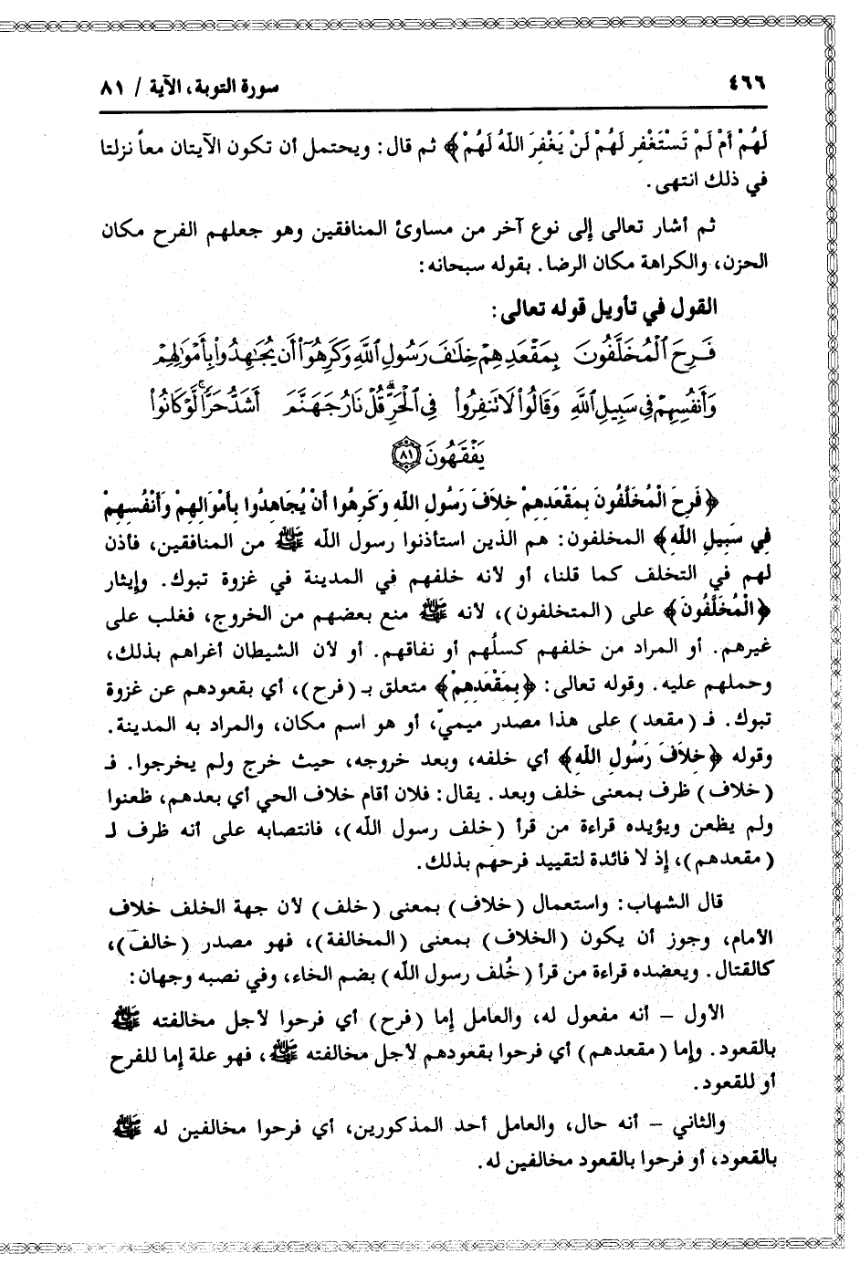 القول في تأويل قوله تعالى: [سورة التوبة (9) : آية 81]