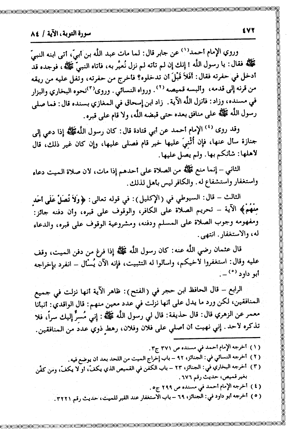 وروي الإمام أحمد «1» عن جابر قال: لما مات عبد الله بن أبيّ، أتى ابنه النبيّ صلى الله عليه وسلّم فقال: يا رسول الله! إنك إن لم تأته لم نزل نعيّر به، فأتاه النبيّ صلّى الله عليه وسلّم، فوجده قد أدخل في حفرته فقال: أفلا قبل أن تدخلوه؟ فأخرج من حفرته، وتفل عليه من ريقه من قرنه إلى قدمه، وألبسه قميصه «2» . ورواه النسائي. وروى «3» نحوه البخاري والبزار في مسنده، وزاد: فأنزل الله الآية. زاد ابن إسحاق في المغازي بسنده قال: فما صلى رسول الله صلّى الله عليه وسلّم على منافق بعده حتى قبضه الله، ولا قام على قبره.