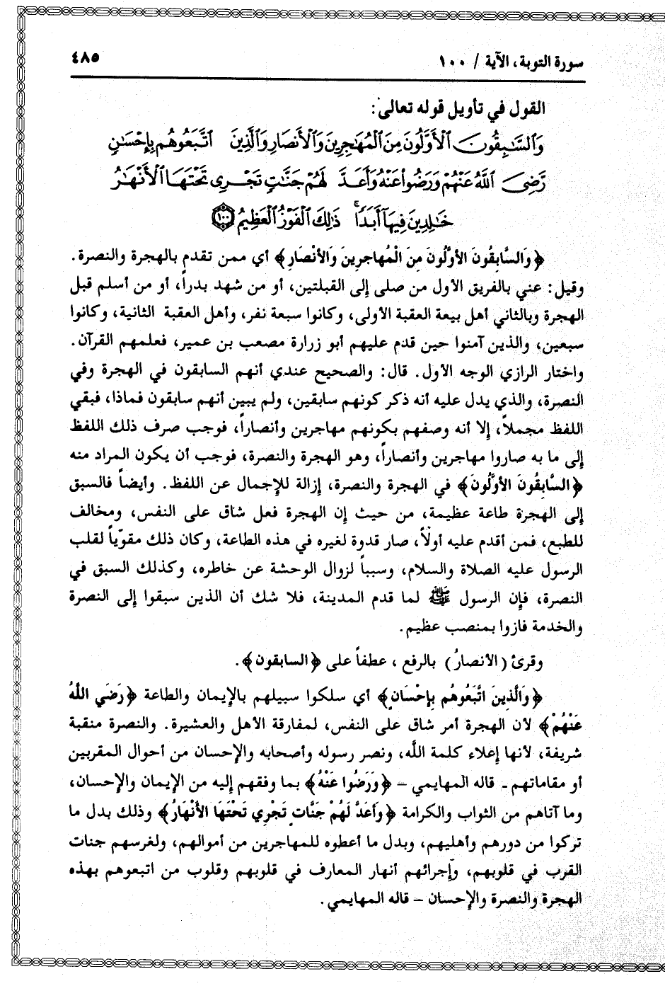 وَالسَّابِقُونَ الْأَوَّلُونَ مِنَ الْمُهاجِرِينَ وَالْأَنْصارِ وَالَّذِينَ اتَّبَعُوهُمْ بِإِحْسانٍ رَضِيَ اللَّهُ عَنْهُمْ وَرَضُوا عَنْهُ وَأَعَدَّ لَهُمْ جَنَّاتٍ تَجْرِي تَحْتَهَا الْأَنْهارُ خالِدِينَ فِيها أَبَداً ذلِكَ الْفَوْزُ الْعَظِيمُ (100)
