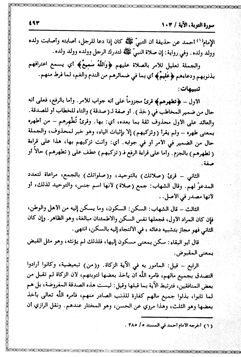 الأول- تُطَهِّرُهُمْ قرئ مجزوما على أنه جواب للأمر. وأما بالرفع، فعلى أنه حال من ضمير المخاطب في (خذ) . أو صفة ل (صدقة) والتاء للخطاب أو للصدقة.