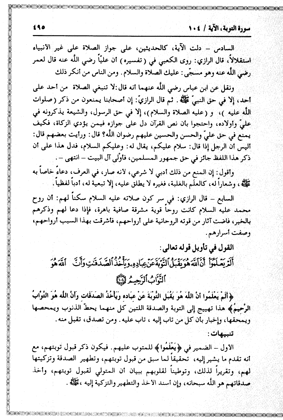 ونقل عن ابن عباس رضي الله عنهما أنه قال: لا تنبغي الصلاة من أحد على أحد، إلا في حق النبيّ صلّى الله عليه وسلّم. ثم قال الرازيّ: إن أصحابنا يمنعون من ذكر (صلوات الله عليه) ، و (عليه الصلاة والسلام) ، إلا في حق الرسول، والشيعة يذكرونه في عليّ وأولاده، واحتجوا بأن نص القرآن دل على جوازه فيمن يؤدي الزكاة، فكيف يمنع في حق عليّ والحسن والحسين عليهم رضوان الله؟ قال: ورأيت بعضهم قال: