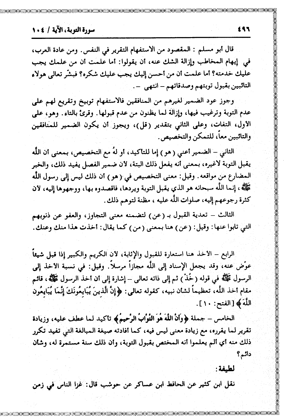 الرابع- الأخذ هنا استعارة للقبول والإثابة، لأن الكريم والكبير إذا قبل شيئا عوّض عنه، وقد يجعل الإسناد إلى الله مجازا مرسلا. وقيل: في نسبة الأخذ إلى الرسول صلّى الله عليه وسلّم في قوله (خذ) ثم إلى ذاته تعالى- إشارة إلى أن أخذ الرسول صلّى الله عليه وسلّم، قائم مقام أخذ الله، تعظيما لشأن نبيه، كقوله تعالى: إِنَّ الَّذِينَ يُبايِعُونَكَ إِنَّما يُبايِعُونَ اللَّهَ [الفتح: 10] .