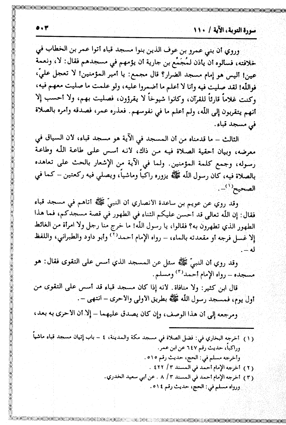 الثالث- ما قدمناه من أن المسجد في الآية هو مسجد قباء، لأن السياق في معرضه، وبيان أحقية الصلاة فيه من ذاك، لأنه أسس على طاعة الله وطاعة رسوله، وجمع كلمة المؤمنين. ولما في الآية من الإشعار بالحث على تعاهده بالصلاة فيه،