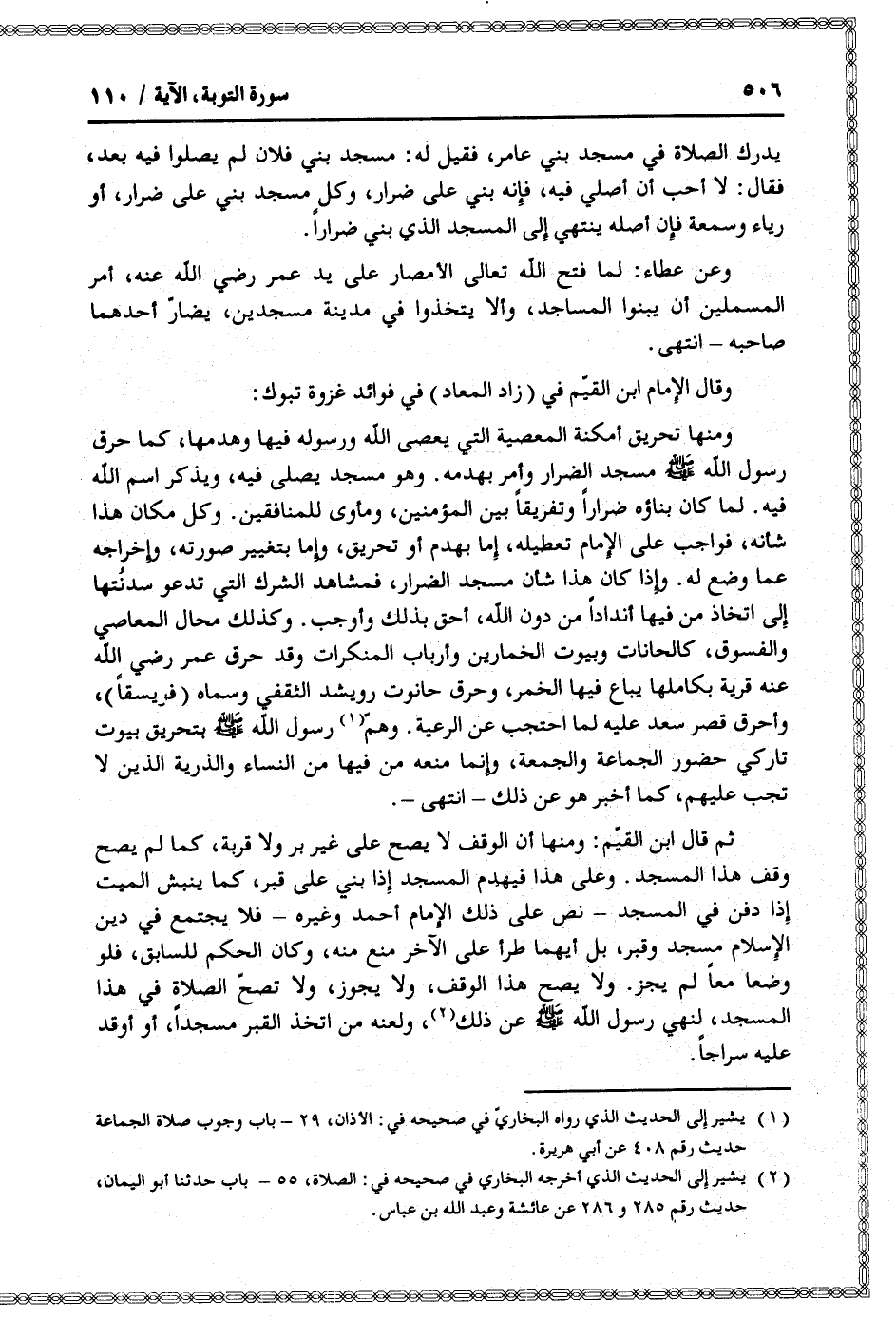 ثم قال ابن القيّم: ومنها أن الوقف لا يصح على غير بر ولا قربة، كما لم يصح وقف هذا المسجد. وعلى هذا فيهدم المسجد إذا بني على قبر، كما ينبش الميت إذا دفن في المسجد- نص على ذلك الإمام أحمد وغيره- فلا يجتمع في دين الإسلام مسجد وقبر، بل أيهما طرأ على الآخر منع منه، وكان الحكم للسابق، فلو وضعا معا لم يجز. ولا يصح هذا الوقف، ولا يجوز، ولا تصحّ الصلاة في هذا المسجد، لنهي رسول الله صلّى الله عليه وسلّم عن ذلك «2» ، ولعنه من اتخذ القبر مسجدا، أو أوقد عليه سراجا.