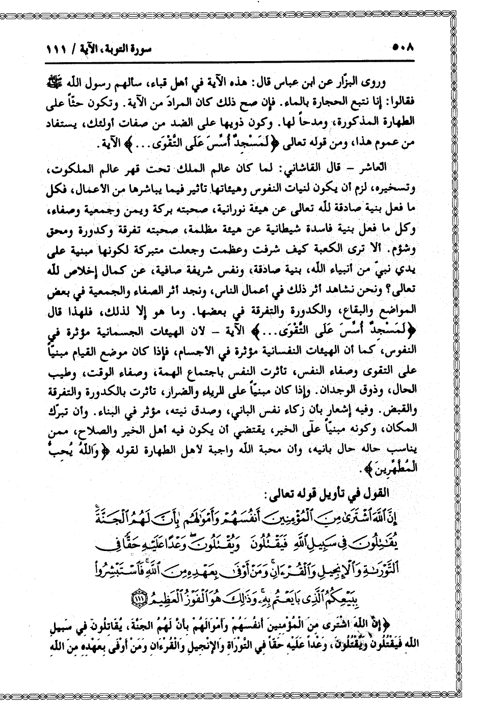 العاشر- قال القاشاني: لما كان عالم الملك تحت قهر عالم الملكوت، وتسخيره، لزم أن يكون لنيات النفوس وهيئاتها تأثير فيما يباشرها من الأعمال، فكل ما فعل بنية صادقة لله تعالى عن هيئة نورانية، صحبته بركة ويمن وجمعية وصفاء، وكل ما فعل بنية فاسدة شيطانية عن هيئة مظلمة، صحبته تفرقة وكدورة ومحق وشؤم. ألا ترى الكعبة كيف شرفت وعظمت وجعلت متبركة لكونها مبنية على يدي نبيّ من أنبياء الله، بنية صادقة، ونفس شريفة صافية، عن كمال إخلاص لله تعالى؟ ونحن نشاهد أثر ذلك في أعمال الناس، ونجد أثر الصفاء والجمعية في بعض المواضع والبقاع، والكدورة والتفرقة في بعضها. وما هو إلا لذلك، فلهذا قال لَمَسْجِدٌ أُسِّسَ عَلَى التَّقْوى ... الآية- لأن الهيئات الجسمانية مؤثرة في النفوس، كما أن الهيئات النفسانية مؤثرة في الأجسام، فإذا كان موضع القيام مبنيّا على التقوى وصفاء النفس، تأثرت النفس باجتماع الهمة، وصفاء الوقت، وطيب الحال، وذوق الوجدان. وإذا كان مبنيّا على الرياء والضرار، تأثرت بالكدورة والتفرقة والقبض. وفيه إشعار بأن زكاء نفس الباني، وصدق نيته، مؤثر في البناء. وأن تبرّك المكان، وكونه مبنيّا على الخير، يقتضي أن يكون فيه أهل الخير والصلاح، ممن يناسب حاله حال بانيه، وأن محبة الله واجبة لأهل الطهارة لقوله وَاللَّهُ يُحِبُّ الْمُطَّهِّرِينَ.