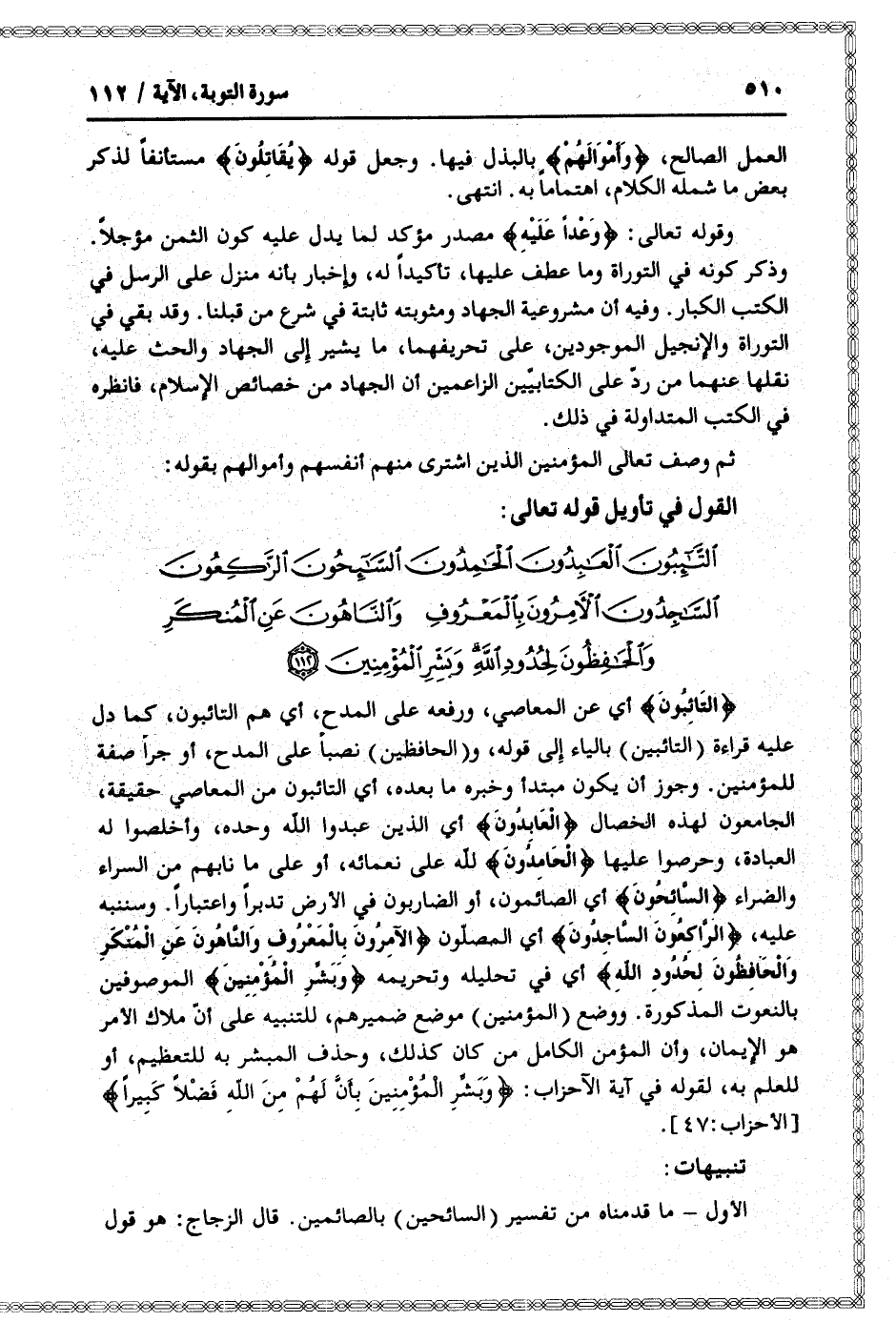 التَّائِبُونَ الْعابِدُونَ الْحامِدُونَ السَّائِحُونَ الرَّاكِعُونَ السَّاجِدُونَ الْآمِرُونَ بِالْمَعْرُوفِ وَالنَّاهُونَ عَنِ الْمُنْكَرِ وَالْحافِظُونَ لِحُدُودِ اللَّهِ وَبَشِّرِ الْمُؤْمِنِينَ (112)