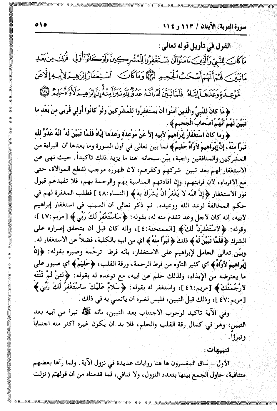 ما كانَ لِلنَّبِيِّ وَالَّذِينَ آمَنُوا أَنْ يَسْتَغْفِرُوا لِلْمُشْرِكِينَ وَلَوْ كانُوا أُولِي قُرْبى مِنْ بَعْدِ ما تَبَيَّنَ لَهُمْ أَنَّهُمْ أَصْحابُ الْجَحِيمِ (113) وَما كانَ اسْتِغْفارُ إِبْراهِيمَ لِأَبِيهِ إِلاَّ عَنْ مَوْعِدَةٍ وَعَدَها إِيَّاهُ فَلَمَّا تَبَيَّنَ لَهُ أَنَّهُ عَدُوٌّ لِلَّهِ تَبَرَّأَ مِنْهُ إِنَّ إِبْراهِيمَ لَأَوَّاهٌ حَلِيمٌ (114)