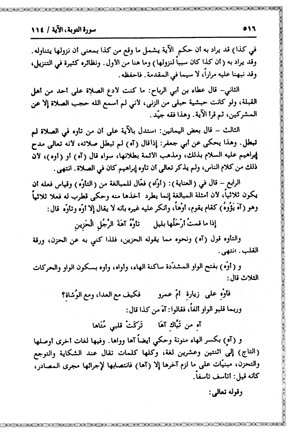 الثالث- قال بعض اليمانين: استدل بالآية على أن من تأوه في الصلاة لم تبطل. وهذا يحكى عن أبي جعفر: إذا قال (آه) لم تبطل صلاته، لأنه تعالى مدح إبراهيم عليه السلام بذلك، ومذهب الأئمة بطلانها، سواء قال (آه) أو (أوه) ، لأن ذلك من كلام الناس، ولم يذكر تعالى أن تأوه إبراهيم كان في الصلاة. انتهى.
