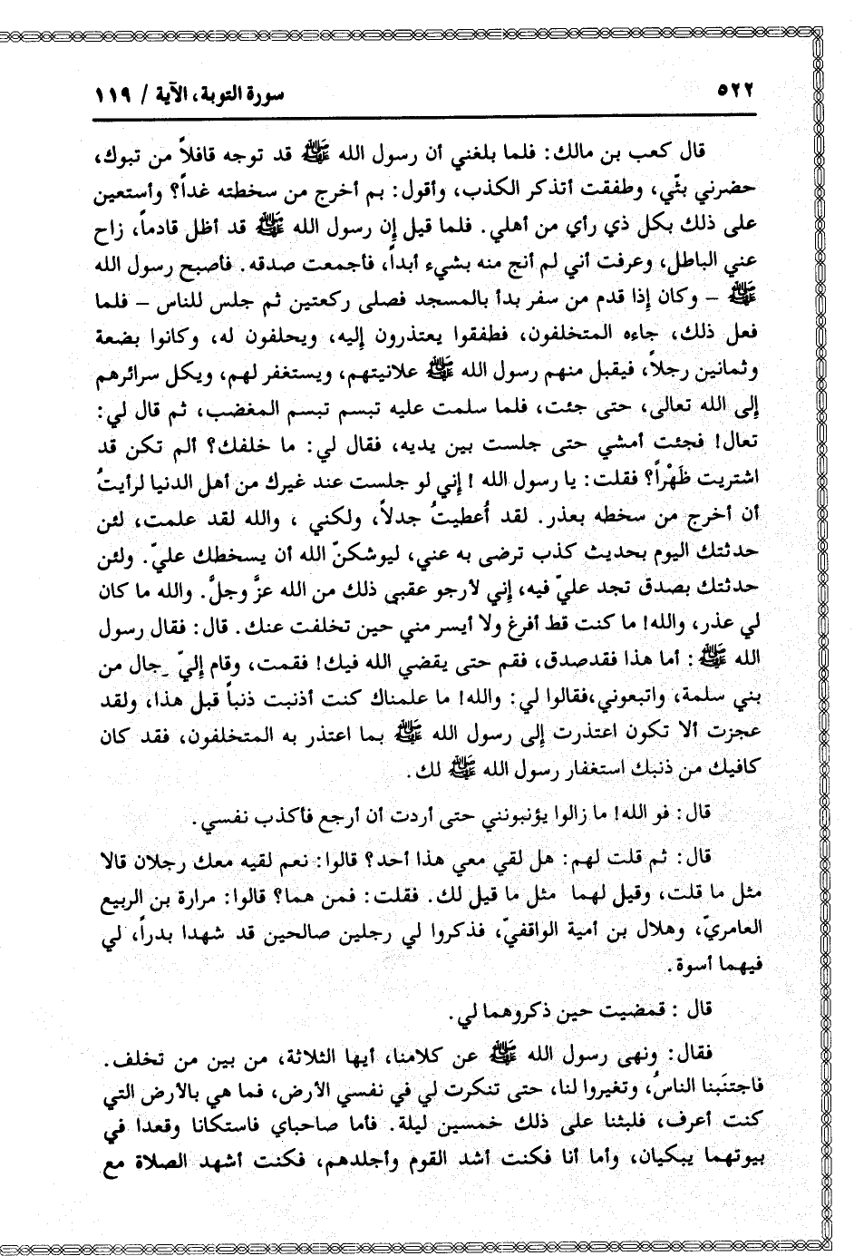تعال! فجئت أمشي حتى جلست بين يديه، فقال لي: ما خلفك؟ ألم تكن قد اشتريت ظهرا؟ فقلت: يا رسول الله! إني لو جلست عند غيرك من أهل الدنيا لرأيت أن أخرج من سخطه بعذر. لقد أعطيت جدلا، ولكني، والله لقد علمت، لئن حدثتك اليوم بحديث كذب ترضى به عني، ليوشكنّ الله أن يسخطك عليّ. ولئن حدثتك بصدق تجد عليّ فيه، إني لأرجو عقبى ذلك من الله عزّ وجلّ. والله ما كان لي عذر، والله! ما كنت قط أفرغ ولا أيسر مني حين تخلفت عنك. قال: فقال رسول الله صلّى الله عليه وسلّم: أما هذا فقد صدق، فقم حتى يقضي الله فيك! فقمت، وقام إليّ رجال من بني سلمة، واتبعوني، فقالوا لي: والله! ما علمناك كنت أذنبت ذنبا قبل هذا، ولقد عجزت ألا تكون اعتذرت إلى رسول الله صلّى الله عليه وسلّم بما اعتذر به المتخلفون، فقد كان كافيك من ذنبك استغفار رسول الله صلّى الله عليه وسلّم لك.
