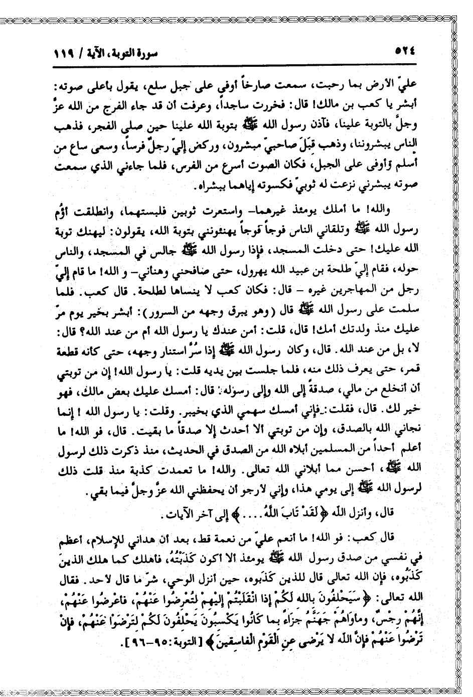 قال كعب: فو الله! ما أنعم عليّ من نعمة قط، بعد أن هداني للإسلام، أعظم في نفسي من صدق رسول الله صلّى الله عليه وسلّم يومئذ ألا أكون كذبته، فأهلك كما هلك الذين كذبوه، فإن الله تعالى قال للذين كذبوه، حين أنزل الوحي، شرّ ما قال لأحد. فقال الله تعالى: سَيَحْلِفُونَ بِاللَّهِ لَكُمْ إِذَا انْقَلَبْتُمْ إِلَيْهِمْ لِتُعْرِضُوا عَنْهُمْ، فَأَعْرِضُوا عَنْهُمْ، إِنَّهُمْ رِجْسٌ، وَمَأْواهُمْ جَهَنَّمُ جَزاءً بِما كانُوا يَكْسِبُونَ يَحْلِفُونَ لَكُمْ لِتَرْضَوْا عَنْهُمْ، فَإِنْ تَرْضَوْا عَنْهُمْ فَإِنَّ اللَّهَ لا يَرْضى عَنِ الْقَوْمِ الْفاسِقِينَ [التوبة: 95- 96] .