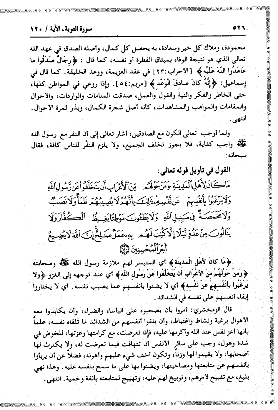ما كانَ لِأَهْلِ الْمَدِينَةِ وَمَنْ حَوْلَهُمْ مِنَ الْأَعْرابِ أَنْ يَتَخَلَّفُوا عَنْ رَسُولِ اللَّهِ وَلا يَرْغَبُوا بِأَنْفُسِهِمْ عَنْ نَفْسِهِ ذلِكَ بِأَنَّهُمْ لا يُصِيبُهُمْ ظَمَأٌ وَلا نَصَبٌ وَلا مَخْمَصَةٌ فِي سَبِيلِ اللَّهِ وَلا يَطَؤُنَ مَوْطِئاً يَغِيظُ الْكُفَّارَ وَلا يَنالُونَ مِنْ عَدُوٍّ نَيْلاً إِلاَّ كُتِبَ لَهُمْ بِهِ عَمَلٌ صالِحٌ إِنَّ اللَّهَ لا يُضِيعُ أَجْرَ الْمُحْسِنِينَ (120)