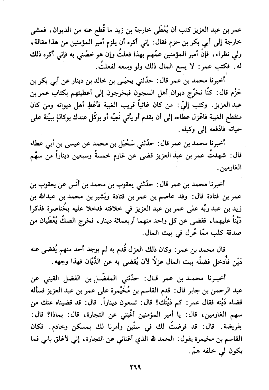 أَخْبَرَنَا مُحَمَّدُ بْنُ عُمَرَ قَالَ: حَدَّثَنِي يَحْيَى بْنُ خَالِدِ بْنِ دِينَارٍ عَنْ أَبِي بَكْرِ بْنِ حَزْمٍ قَالَ: كُنَّا نُخَرِّجُ دِيوَانَ أَهْلِ السُّجُونِ فَيَخْرُجُونَ إِلَى أَعْطَيَتِهِمْ بِكِتَابِ عُمَرَ بْنِ عَبْدِ الْعَزِيزِ. وَكَتَبَ إِلَيَّ: مَنْ كَانَ غَائِبًا قَرِيبَ الْغِيبَةِ فَأَعْطِ أَهْلَ دِيوَانِهِ وَمَنْ كَانَ مُنْقَطِعَ الْغِيبَةِ فَاعْزِلْ عَطَاءَهُ إِلَى أَنْ يَقْدَمَ أَوْ يَأْتِي نَعْيُهُ أَوْ يُوَكَّلُ عِنْدَكَ بِوَكَالَةٍ بِبَيِّنَةٍ عَلَى حَيَاتِهِ فَادْفَعْهُ إِلَى وَكِيلِهِ.