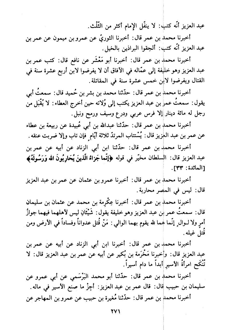 أَخْبَرَنَا مُحَمَّدُ بْنُ عُمَرَ قَالَ: حَدَّثَنَا ابْنُ أَبِي الزِّنَادِ عَنْ أَبِيهِ عَنْ عُمَرَ بْنِ عَبْدِ الْعَزِيزِ قَالَ: السُّلْطَانُ مُخَيَّرٌ فِي قَوْلِهِ «إِنَّما جَزاءُ الَّذِينَ يُحارِبُونَ اللَّهَ وَرَسُولَهُ» المائدة: 33.
