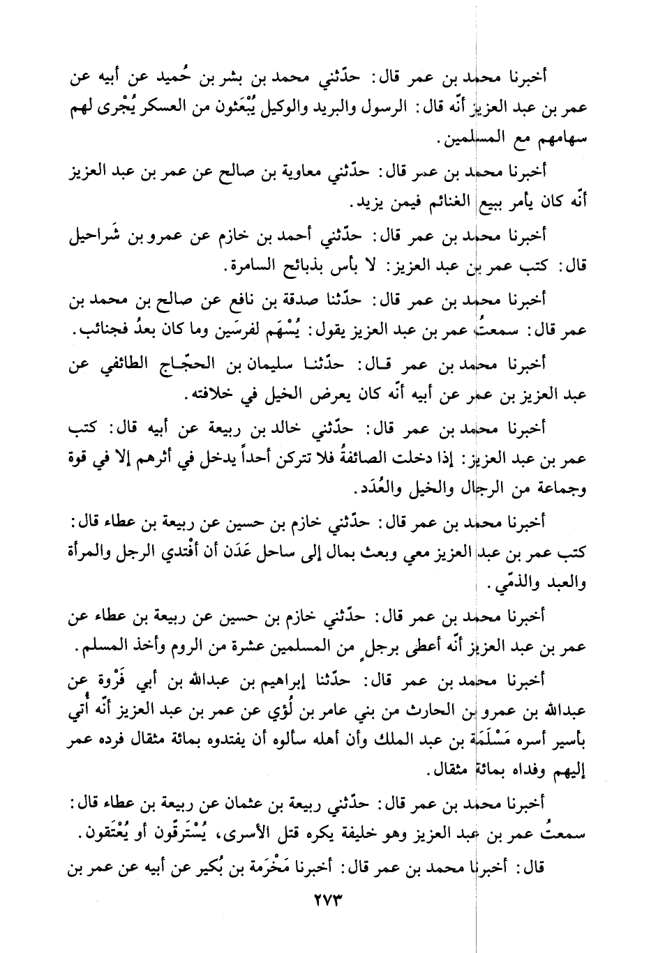 سَمِعْتُ عُمَرَ بْنَ عَبْدِ الْعَزِيزِ وَهُوَ خَلِيفَةٌ يَكْرَهُ قَتْلَ الأَسْرَى. يُسْتَرَقُّونَ أَوْ يُعْتَقُونَ.
